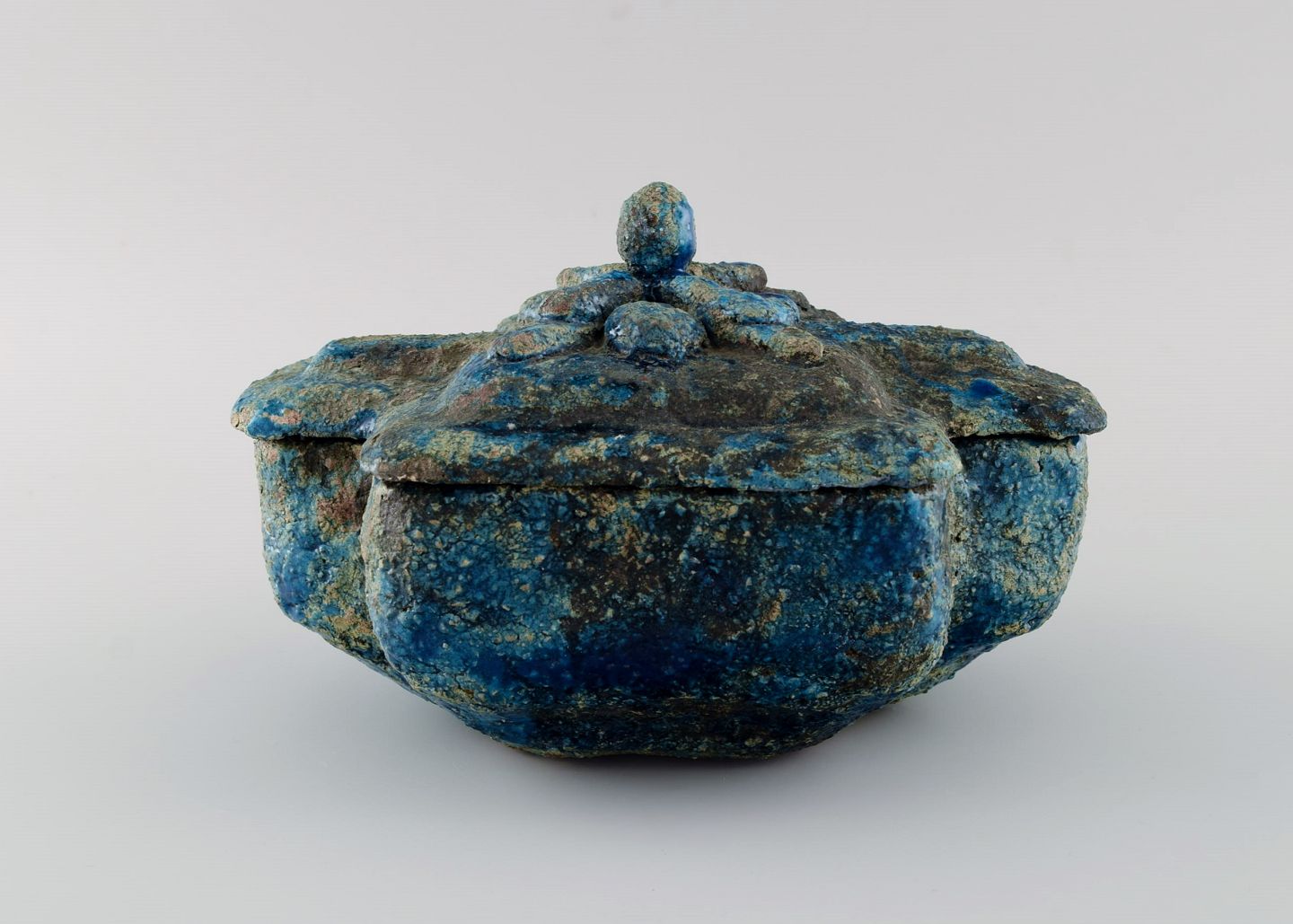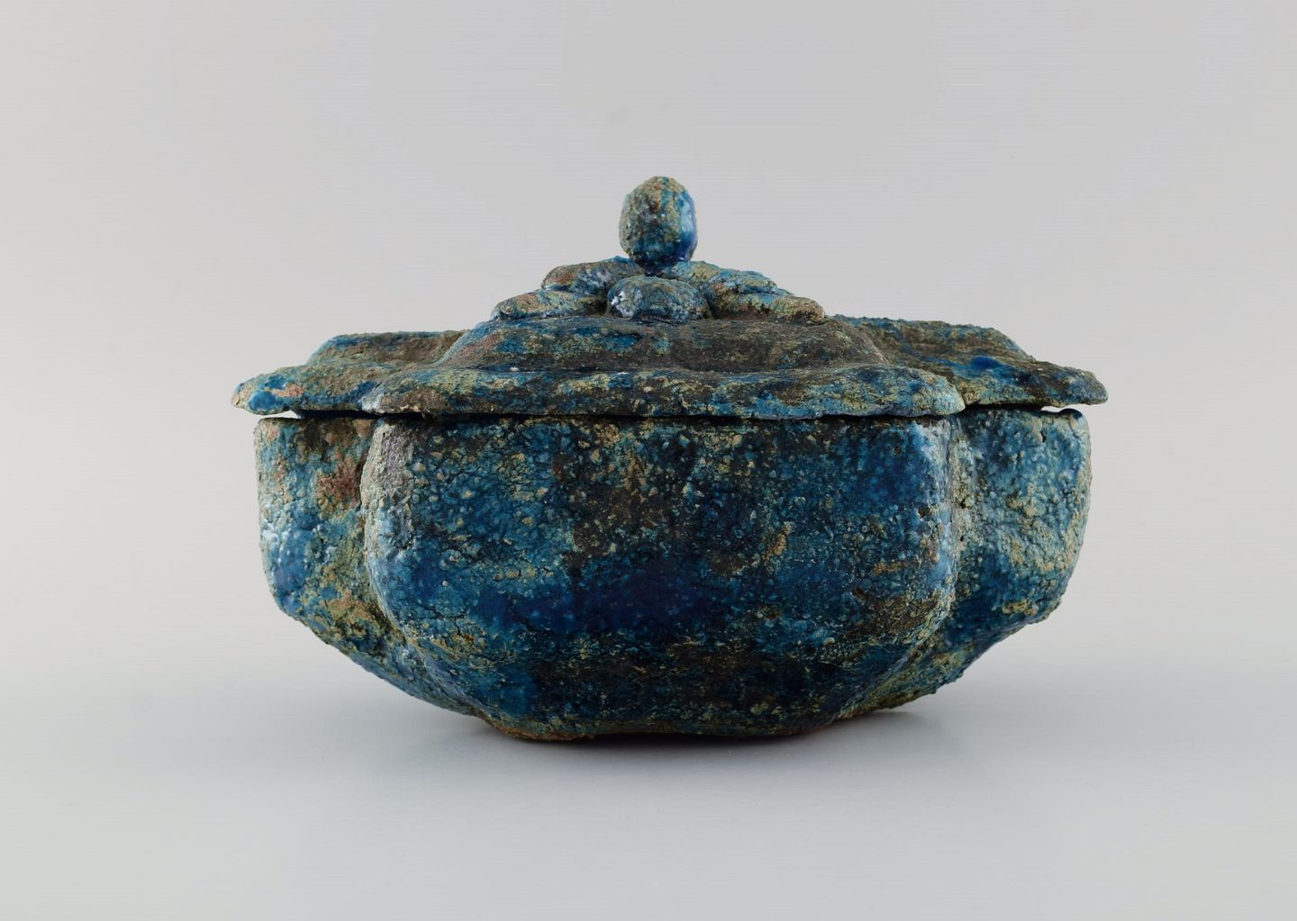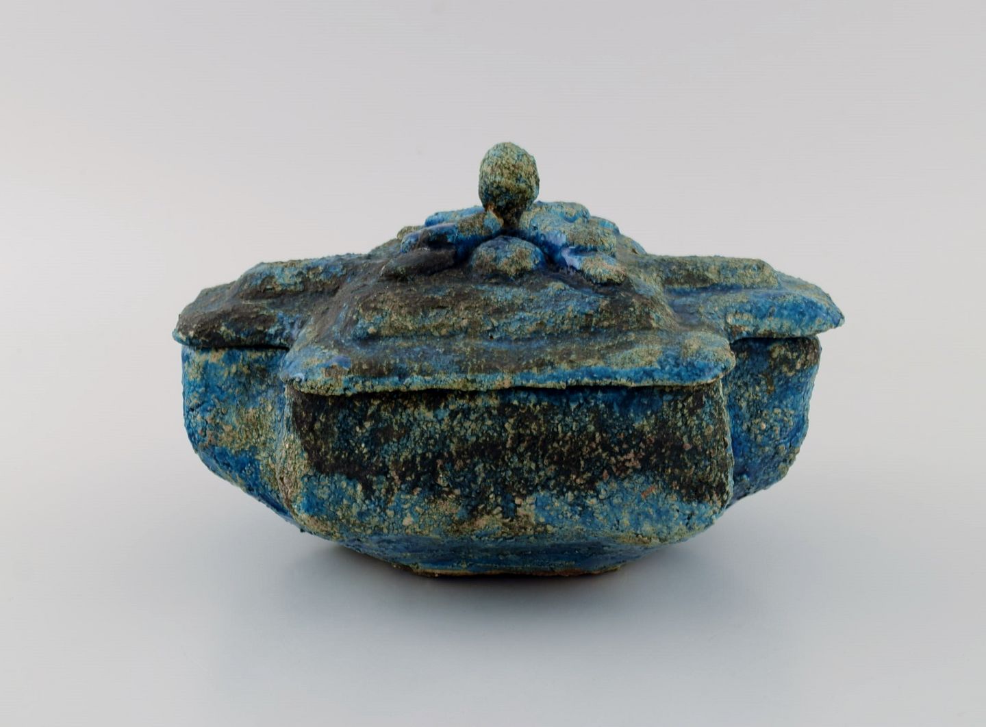 Albert Dahan for Vallauris. Unika art deco lågkrukke i glaseret stentøj. Smuk glasur i blå nuancer. Ca. 1970.