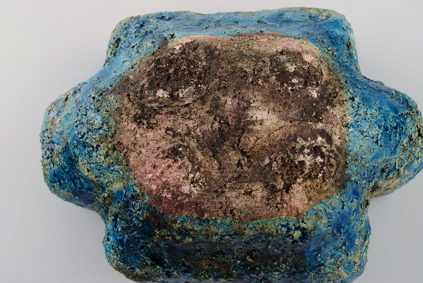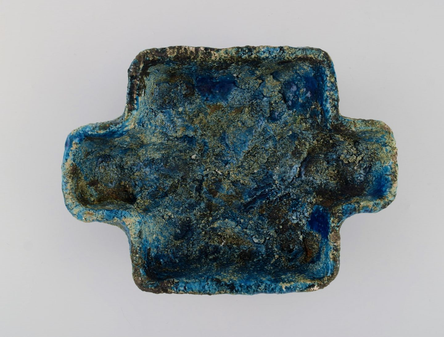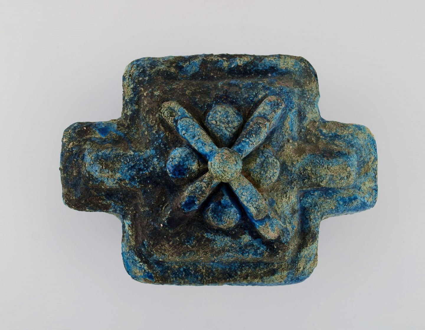 Albert Dahan for Vallauris. Unika art deco lågkrukke i glaseret stentøj. Smuk glasur i blå nuancer. Ca. 1970.
