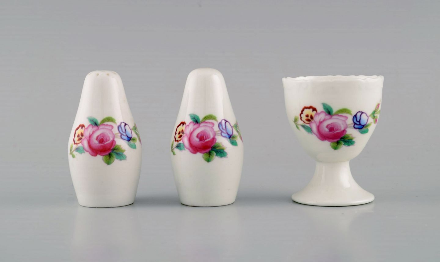Bestående af tekande, salt/peber bøsser, sukker/fløde sæt, dyb og flad tallerken, tekop med underkop, æggebæger og to små skåle. Tekanden måler: 21 x 13,5 cm.