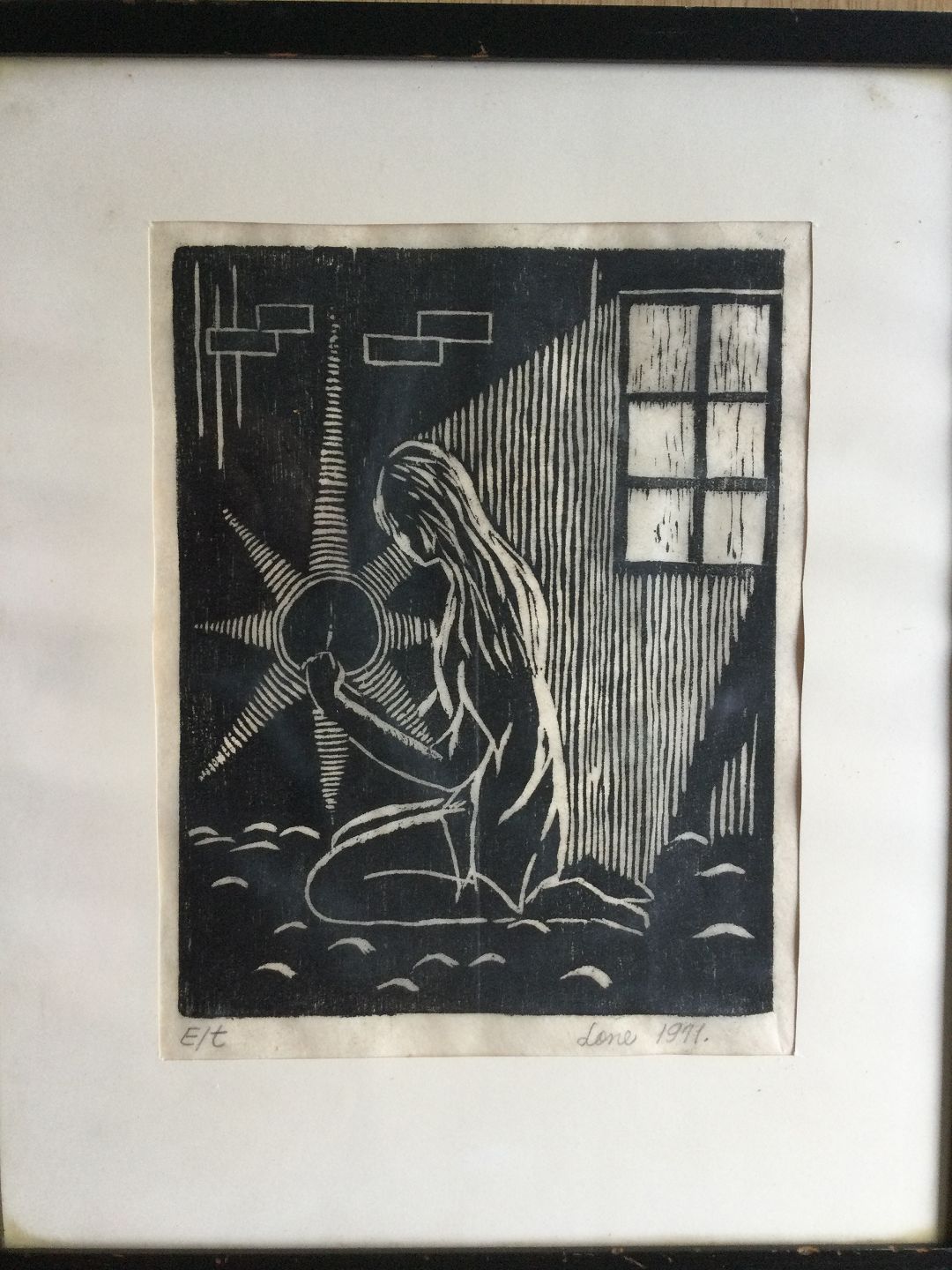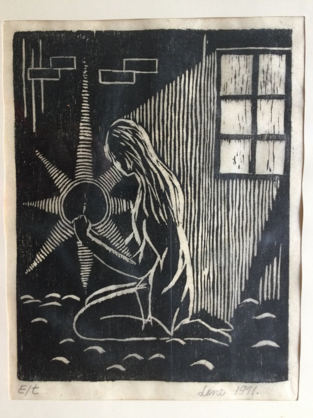 Træsnit af Lone Plaetner - Pige i interiør med tændstik 1971.
