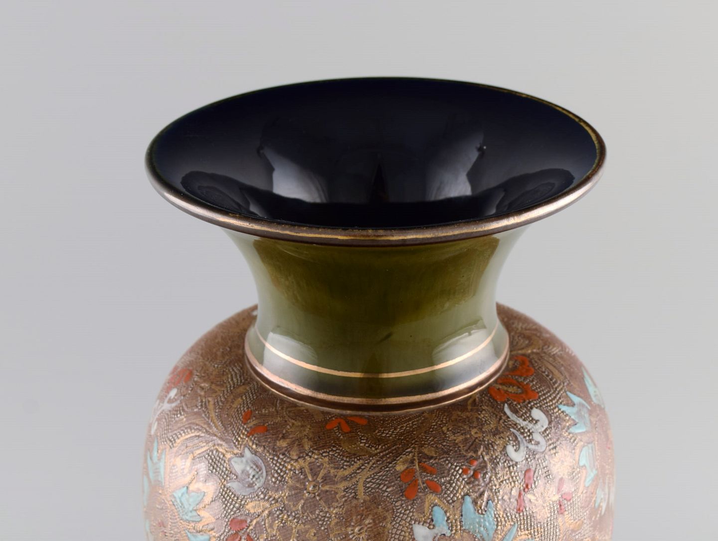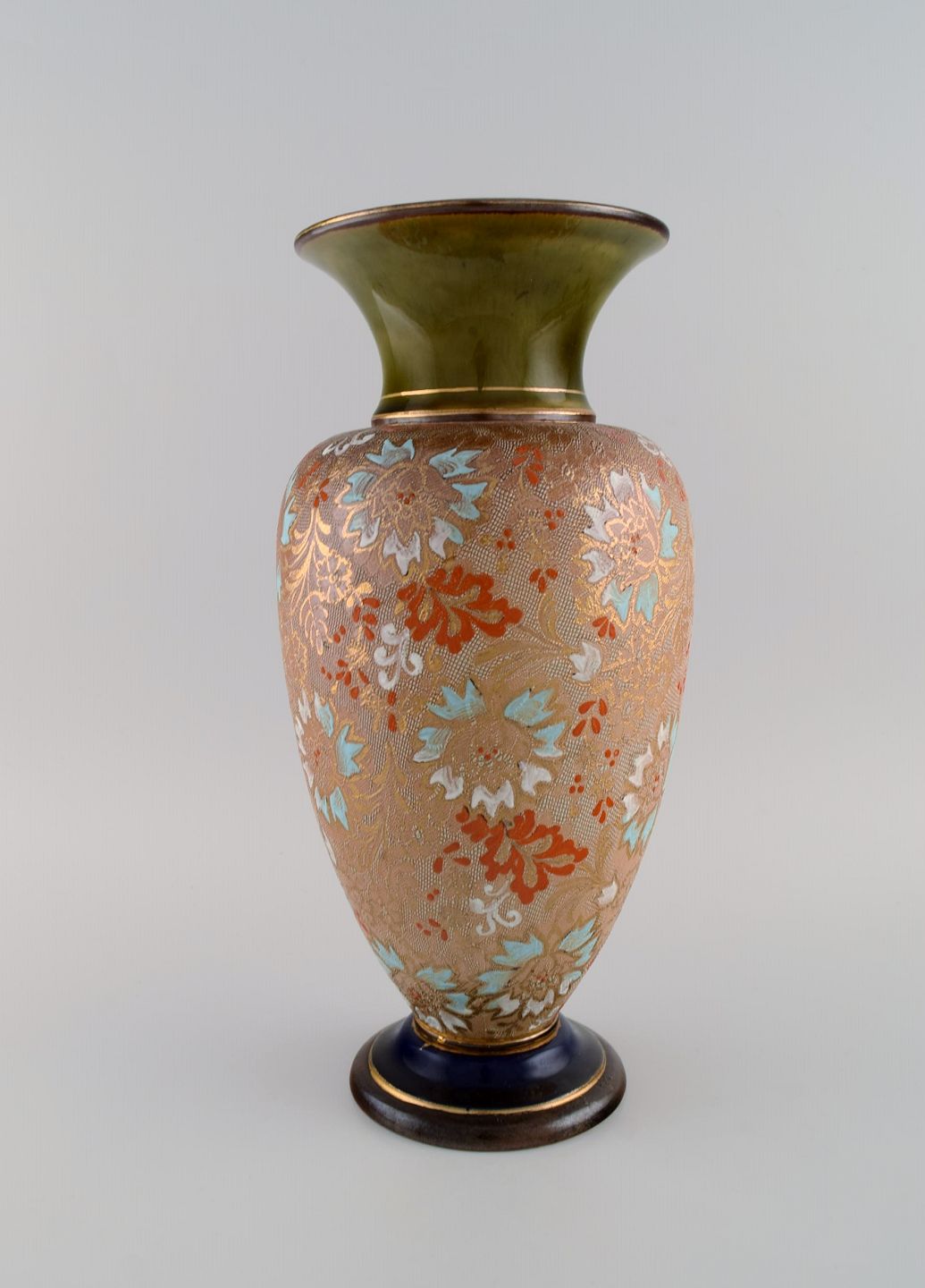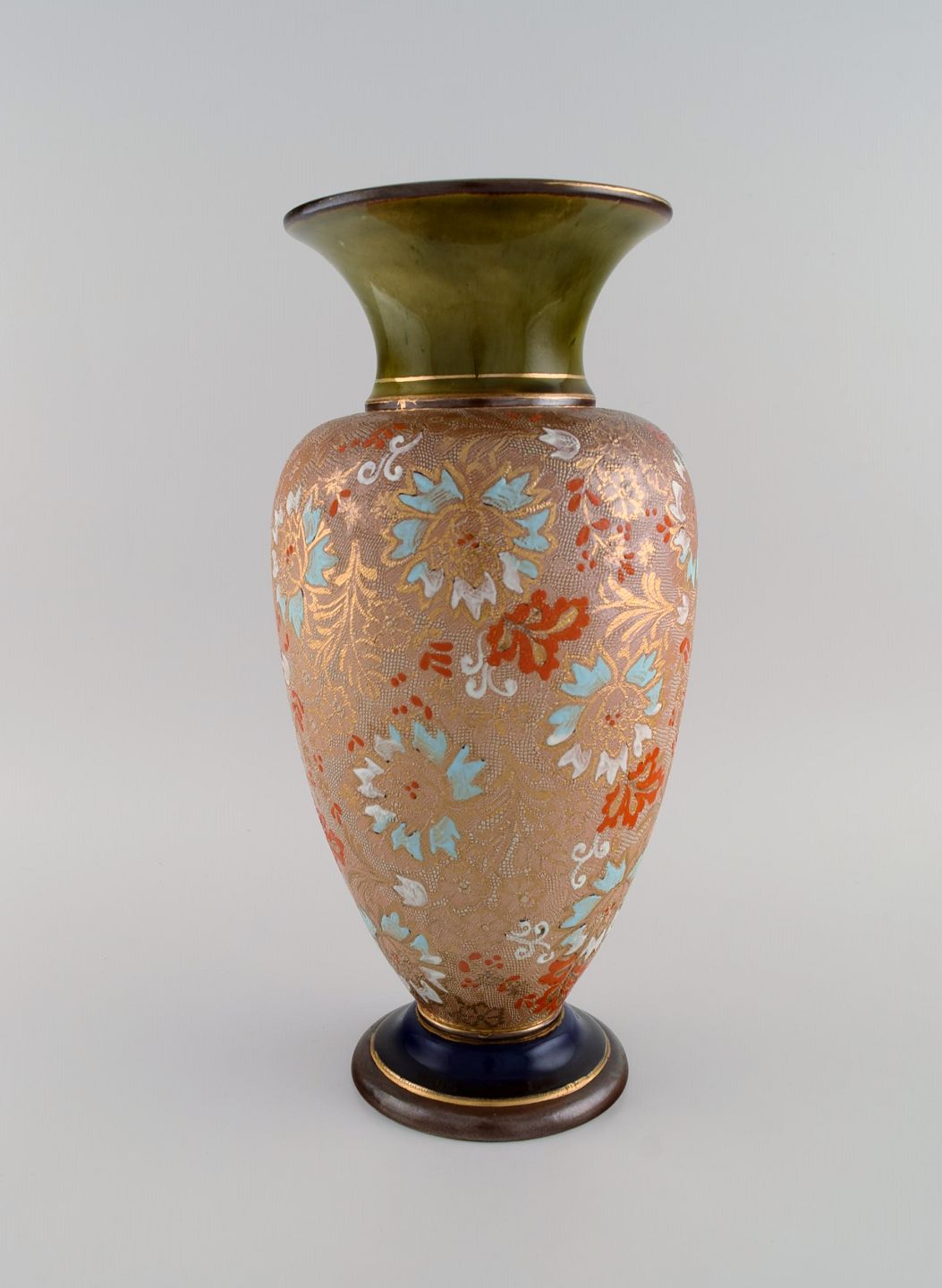 Stor Doulton Lambeth vase i lertøj med håndmalede blomster og gulddekoration. Tidligt 1900-tallet.