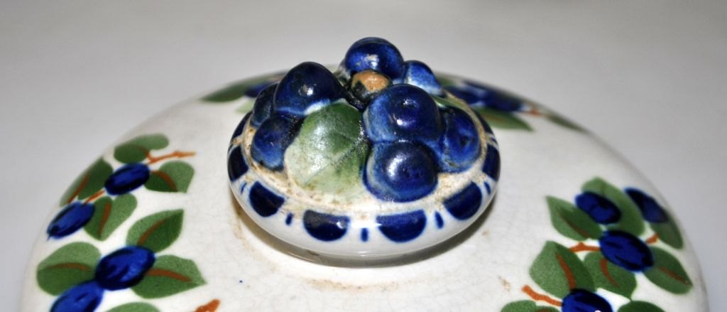 Aluminia bonbonniere, julen 1915, København, Danmark. Fajance, dekorert med blåt, grønt og brunt. Stemplet. Højde.: 12 cm. Dia.: 13 cm.