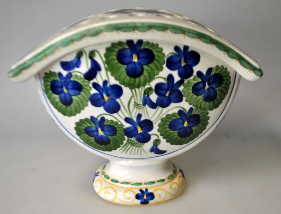 Aluminia jardiniere, 650/411 med hælvet gitter, 20. årh. København, Danmark. Fajance. Dekoreret i blåt, gult og grønt. Stemplet. Hvælvet gitter. Højde.: 16,5 cm. B.: 19,5 cm.