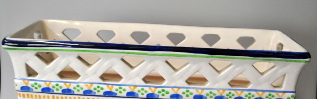 Aluminia jardiniere uden gitter, 838/608, København, Danmark. Fajance. Dekorerert med blåt, gult, grønt og rødt. Stemplet. H.: 19 cm. L.: 28 cm. B.: 10,5 cm.