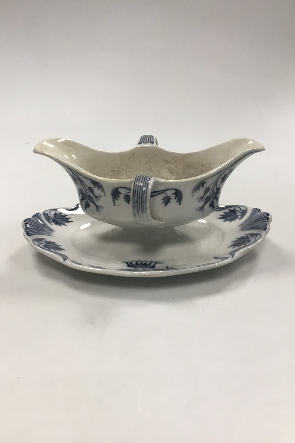 Villeroy og Boch Milla/Tidsel Sauceskål med fast underfad. Måler 22 x 15 x 12 cm (8 21/32 x 5 29/32 x 4 23/32 in). Underfad måler 25,5 x 17 cm (10 3/64 x 5 33/64 in). Fremstår med mindre afslag, misfarvning og/eller krakelering.