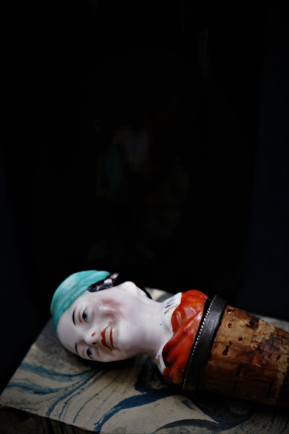 Sjov , gammel vinprop i bemalet porcelæn med buste af Kvinde.