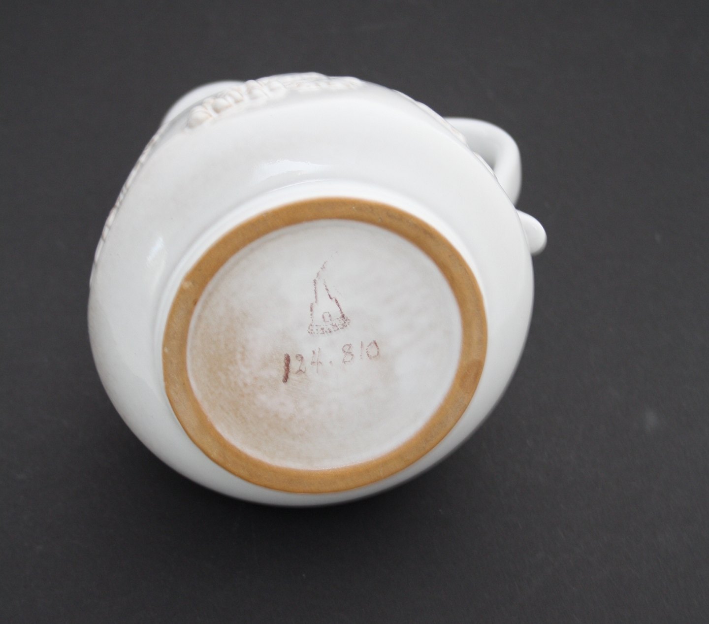Knabstrup, Hvid kande vindrueklaser. Nr. 124.810. Højde 17,5 cm. Diameter bund 12,5 cm. Flot stand. Pris: 425 kr.