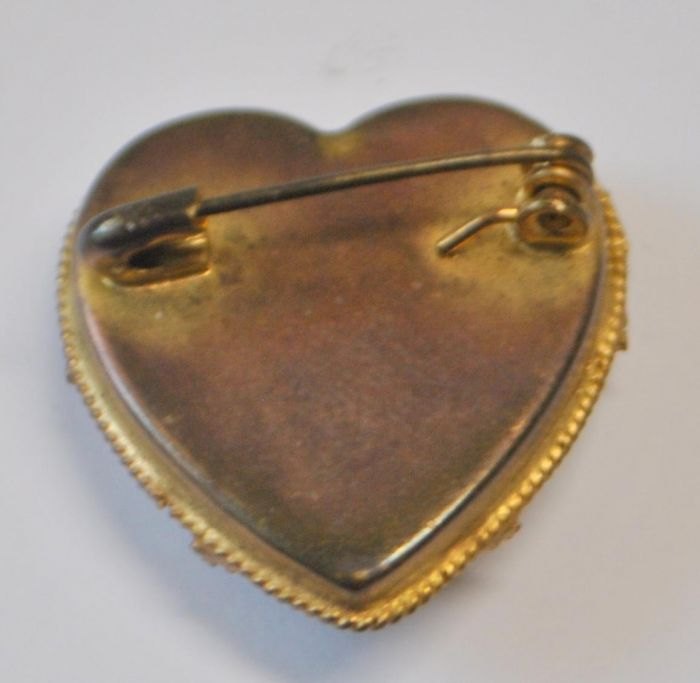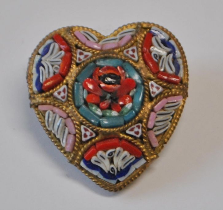 Micro mosaik brosche, 19. årh. Italien. Udført som et hjerte. Messing montage. H.: 2,9 cm. B.: 2,6 cm.