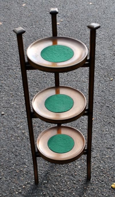 Engelsk cake stand i poleret mahogni med intarsia, 19. årh. Med trehylder.Kan klappes sammen. Højde.: 80 cm.