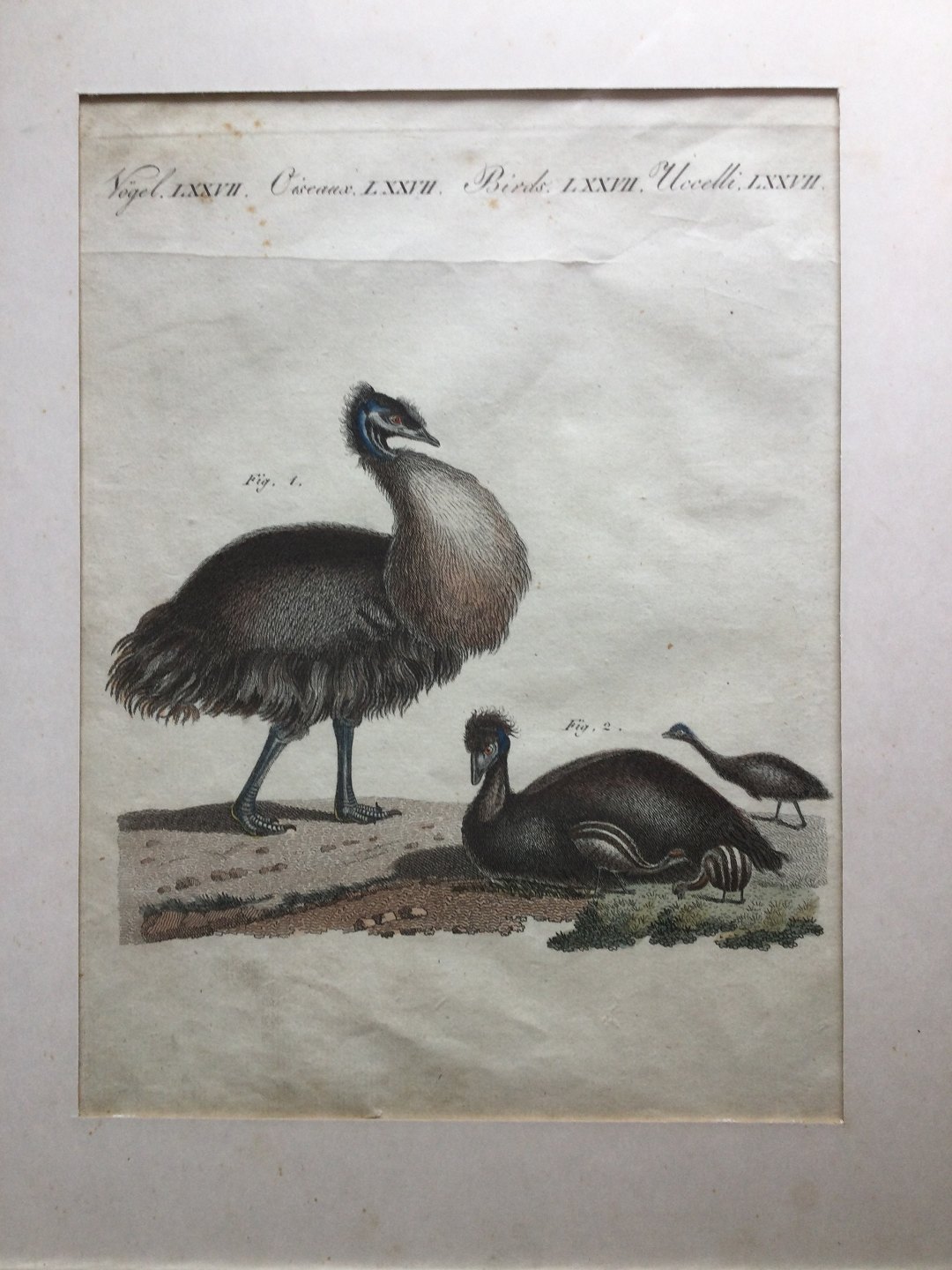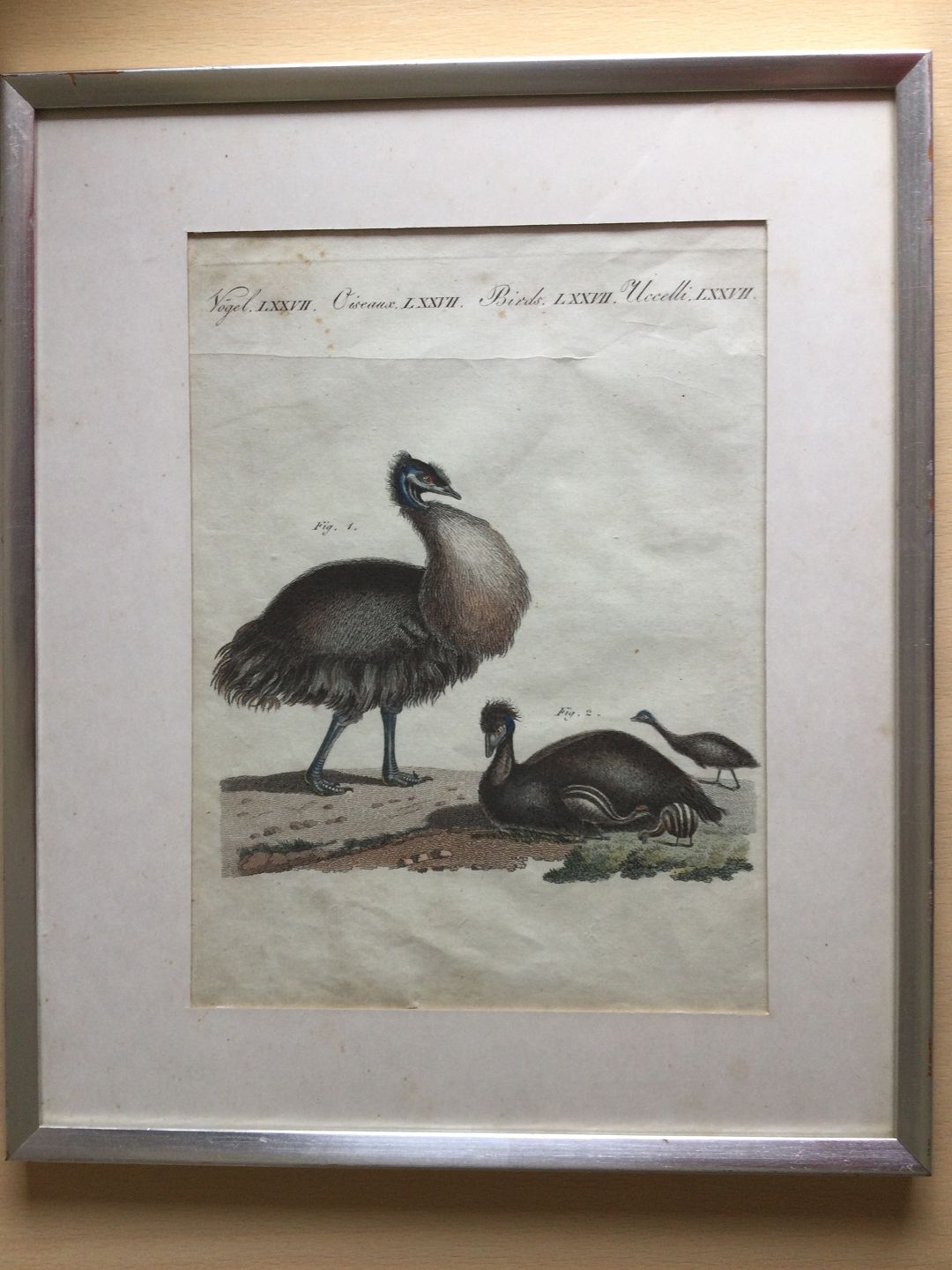 Håndkoloreret kobberstik af Friedrich Justin Bertuch 1805 - Dværg Emuer.