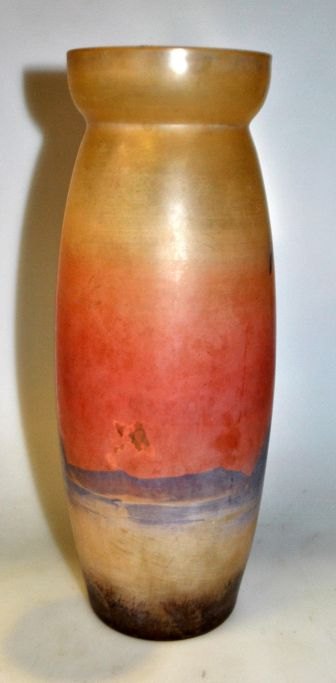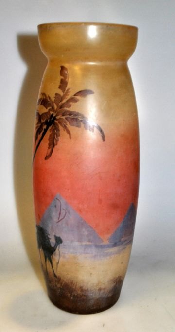 Jugend vase, ca. 1900. Frankrig. Klar glas med overmalinger i emaljefarver i form af Pyramiderne i Ægypten m.v. H.:28,5 cm.