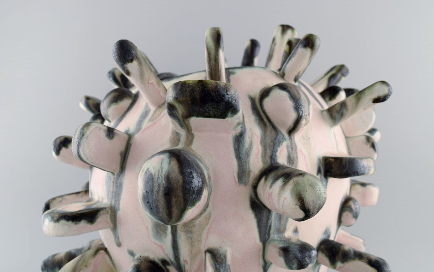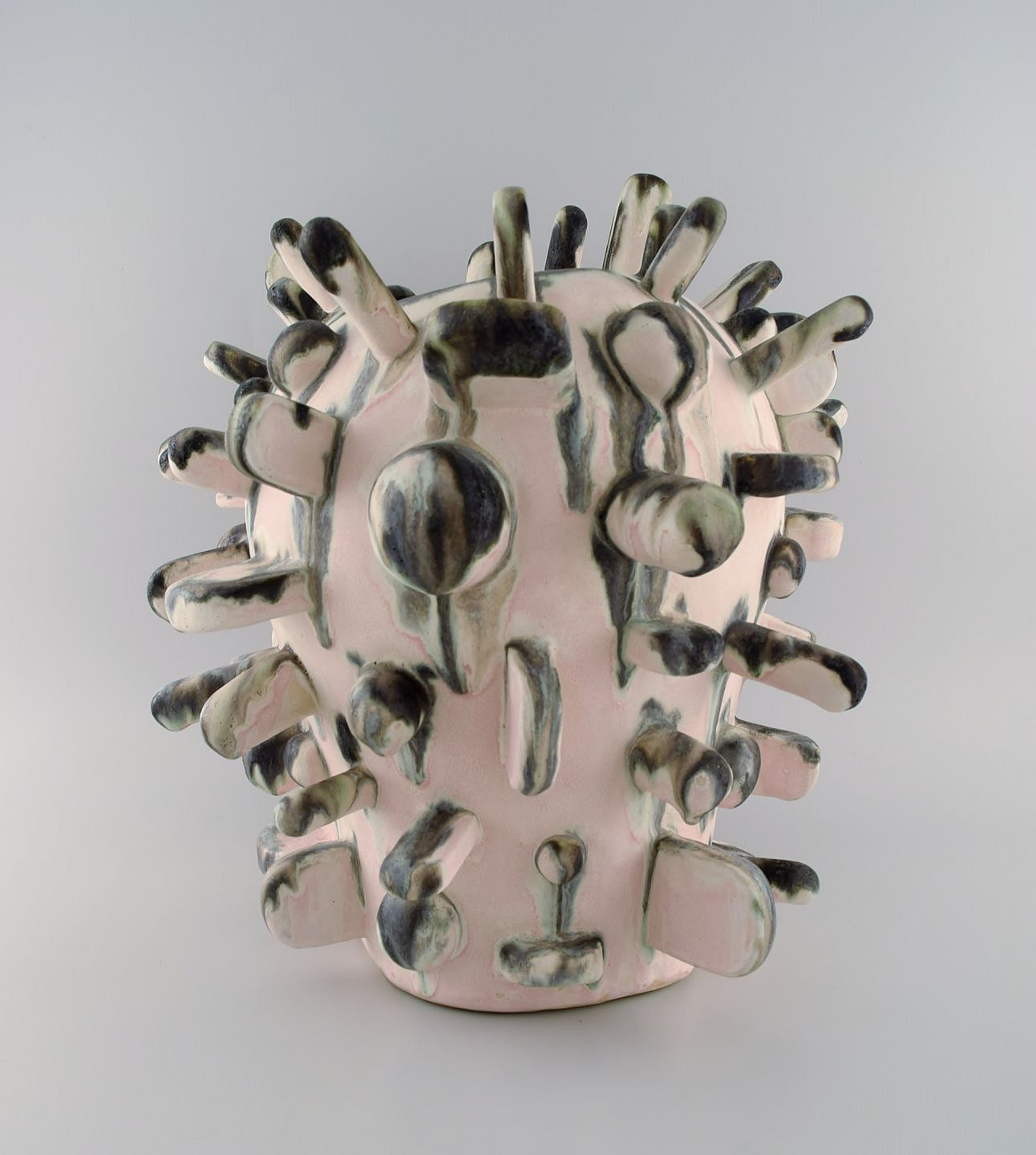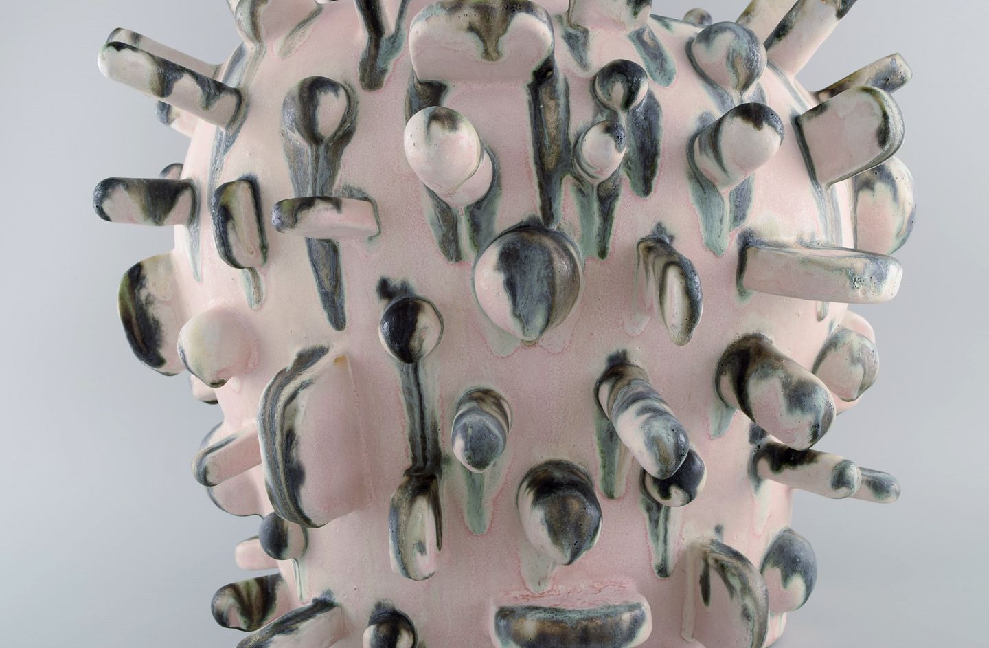 Christina Muff, dansk samtidskeramiker (f. 1971). Meget stor skulpturel unika vase i glaseret stentøj. Hvid/sart rosa glasur som bund. Grå løbeglasur på alle spidser.