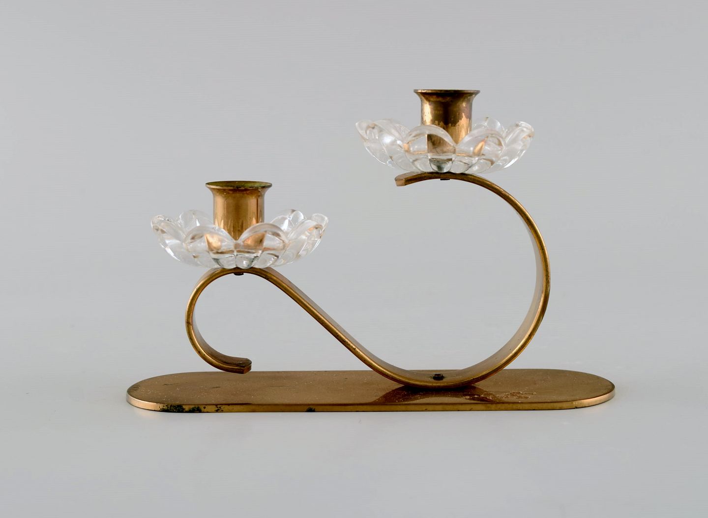 Gunnar Ander for Ystad Metall. To lysestager i messing og klart kunstglas formet som blomster. 1950'erne.