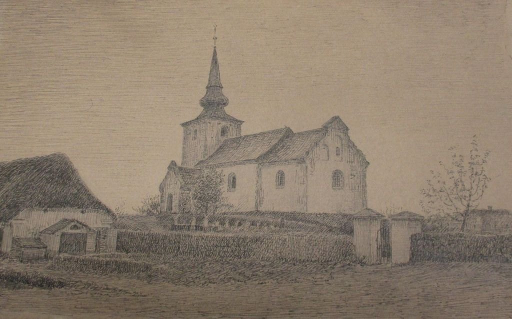 Fritz, Marcus Bech (1868 - 1942) Denmark: Bredsten Church. Ink on paper. 21.5 x 35 cm. Signed .: MB Fritz. Unframed.
