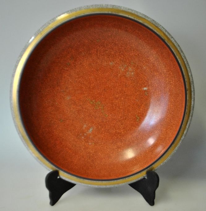 Royal Copenhagen craquele bord skål med forgyldninger, 3606, 20. årh. København, Danmark. Udvendig grå skærv, indvendig rødt skær med forgyldte grene. Stemplet. H.: 5 cm. Dia.: 25 cm. 2. Sortering.
