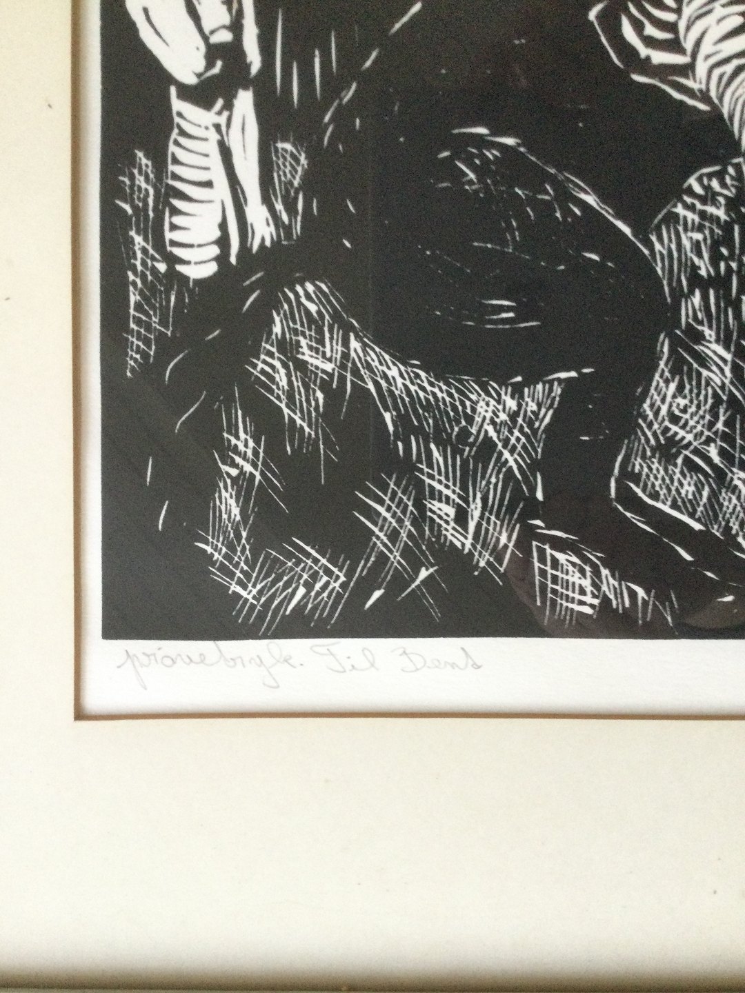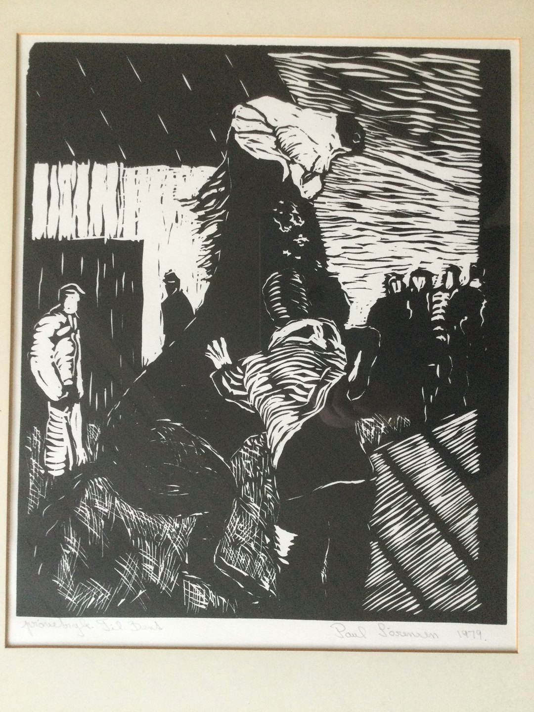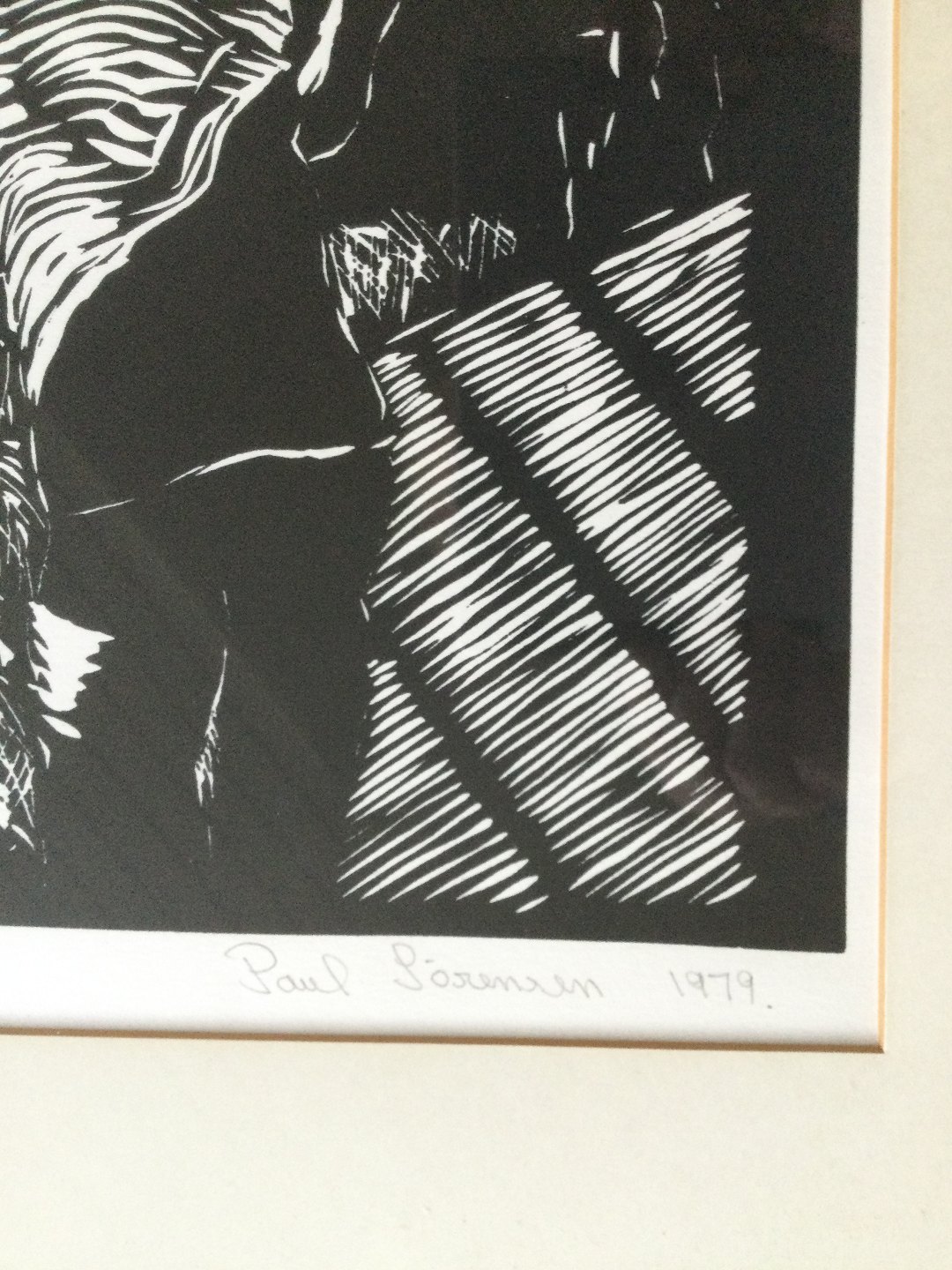 Træsnit af Poul Sørensen - Stejlende hest og personer 1979.