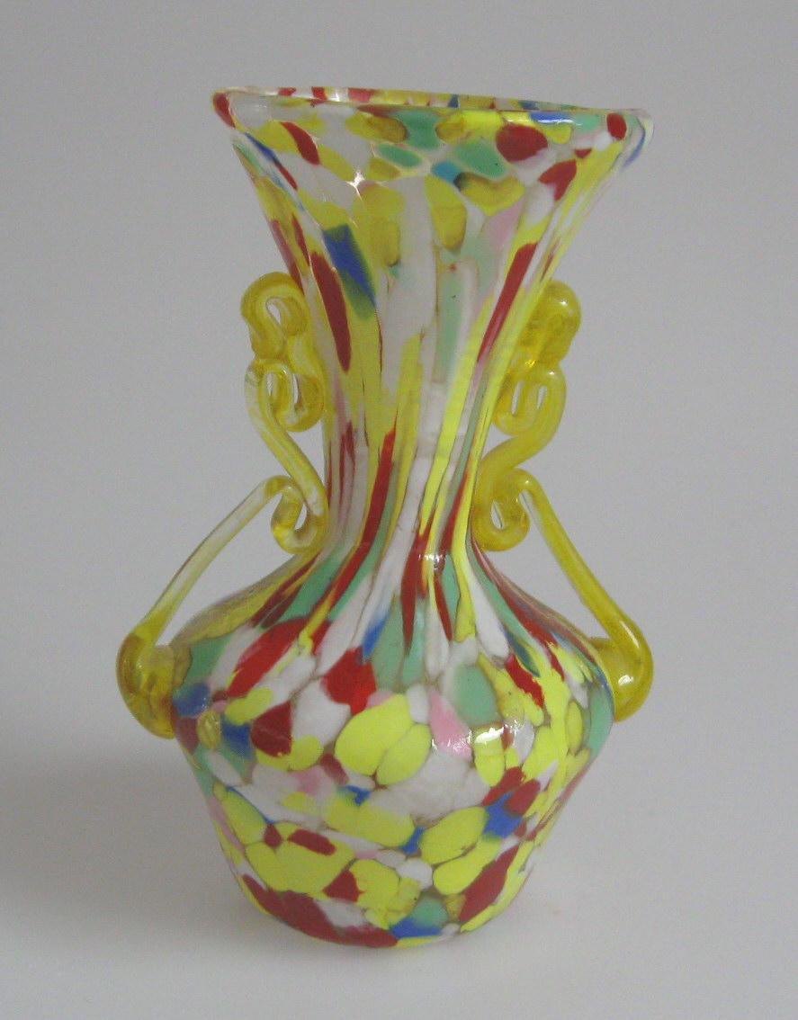Italiensk vase, i flerfarvet glas, med hanke i gult glas. 20. årh. Venedig. H.: 15 cm.