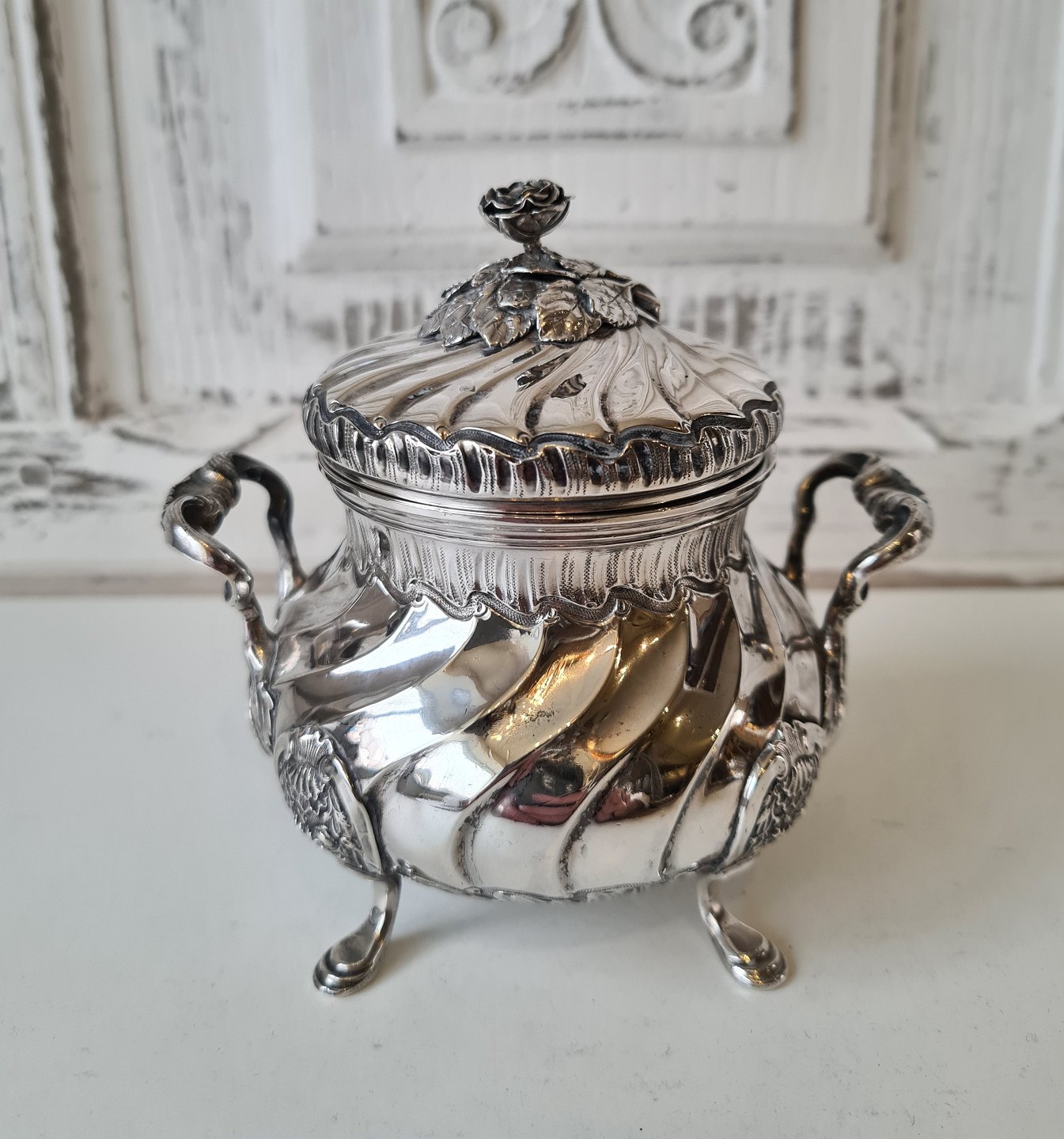 Smuk sukkerskål i rokoko inspireret design med rose som lågknop.