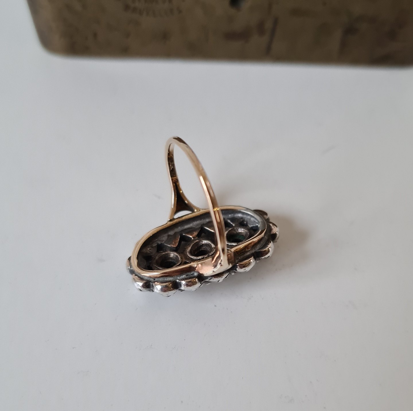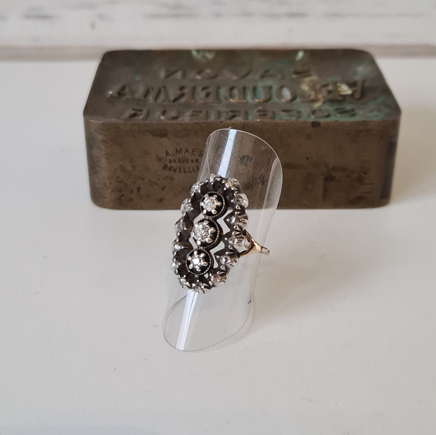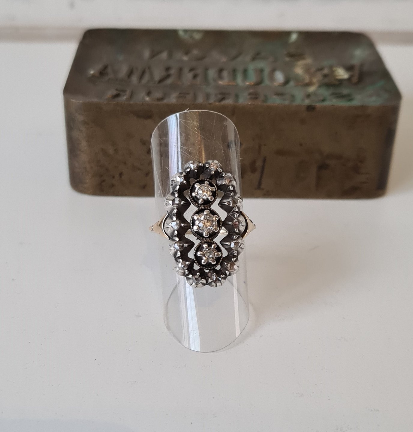 Antik diamantring fra midten af 1800tallet i sølv og 14 kt guld. Diamanterne er fattet i sølv, rammen og ringskinden er udført i 14 kt guld.
