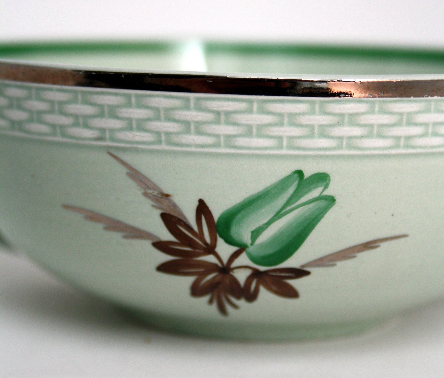 Aluminia, Hardenberg, Boullionkop med underkop. Hardenberg er lysegrønt stel dekoreret med håndmalet grøn og brun blomstermotiv og med udvendig sølvkant. Designet af Nicolaj Tidemand i 1934. Det er et af de mere sjældne stel. Grundstellet er Victoria II stellet med runde former fra 1933-67 designet af Nils Thorsson.