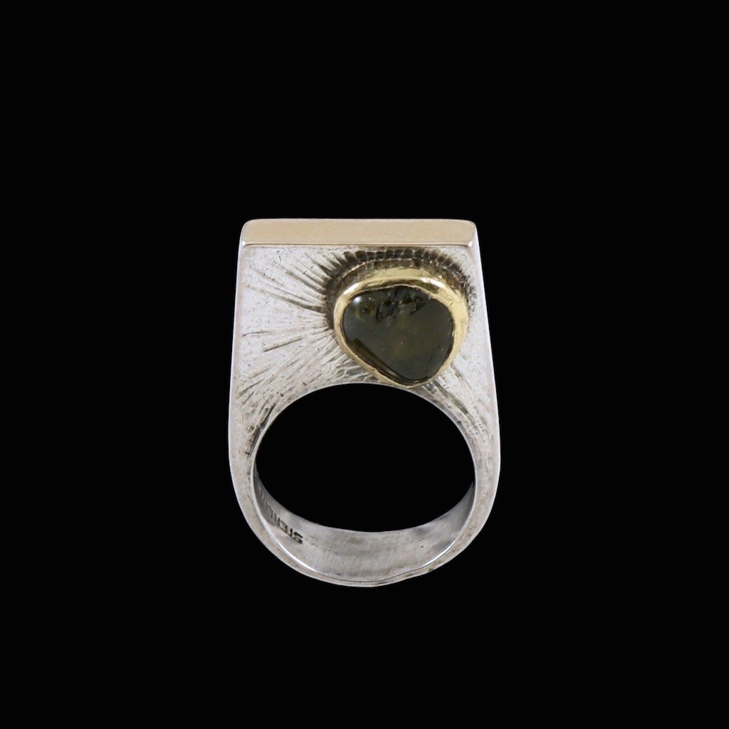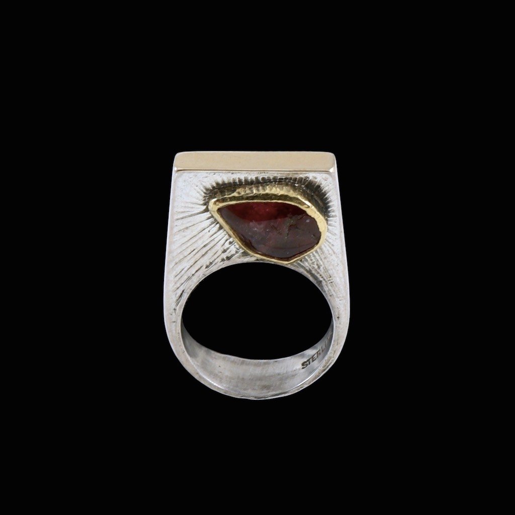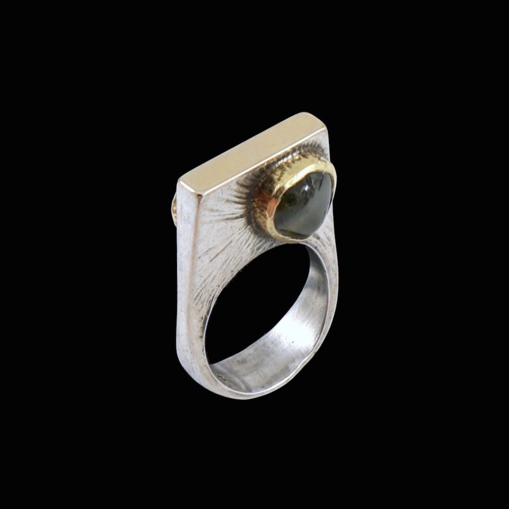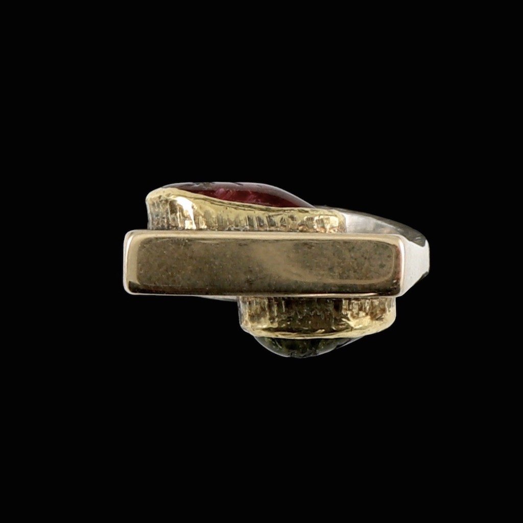 Ole Waldemar Jacobsen. Ring i Sterling sølv med 18k guld samt rød & grøn turmalin.