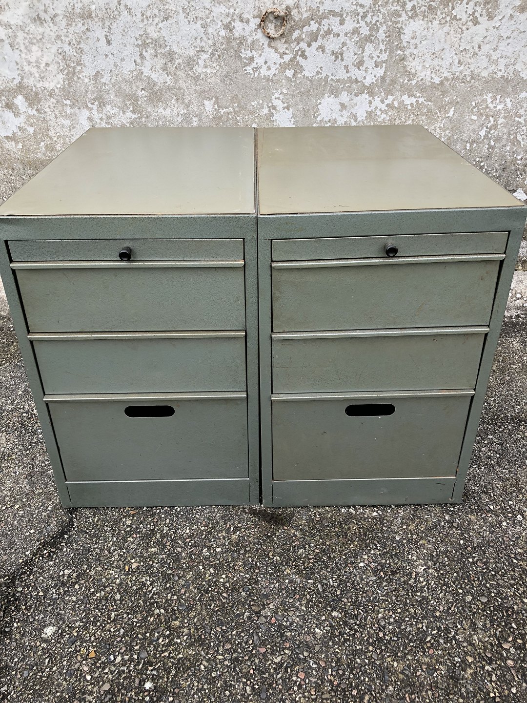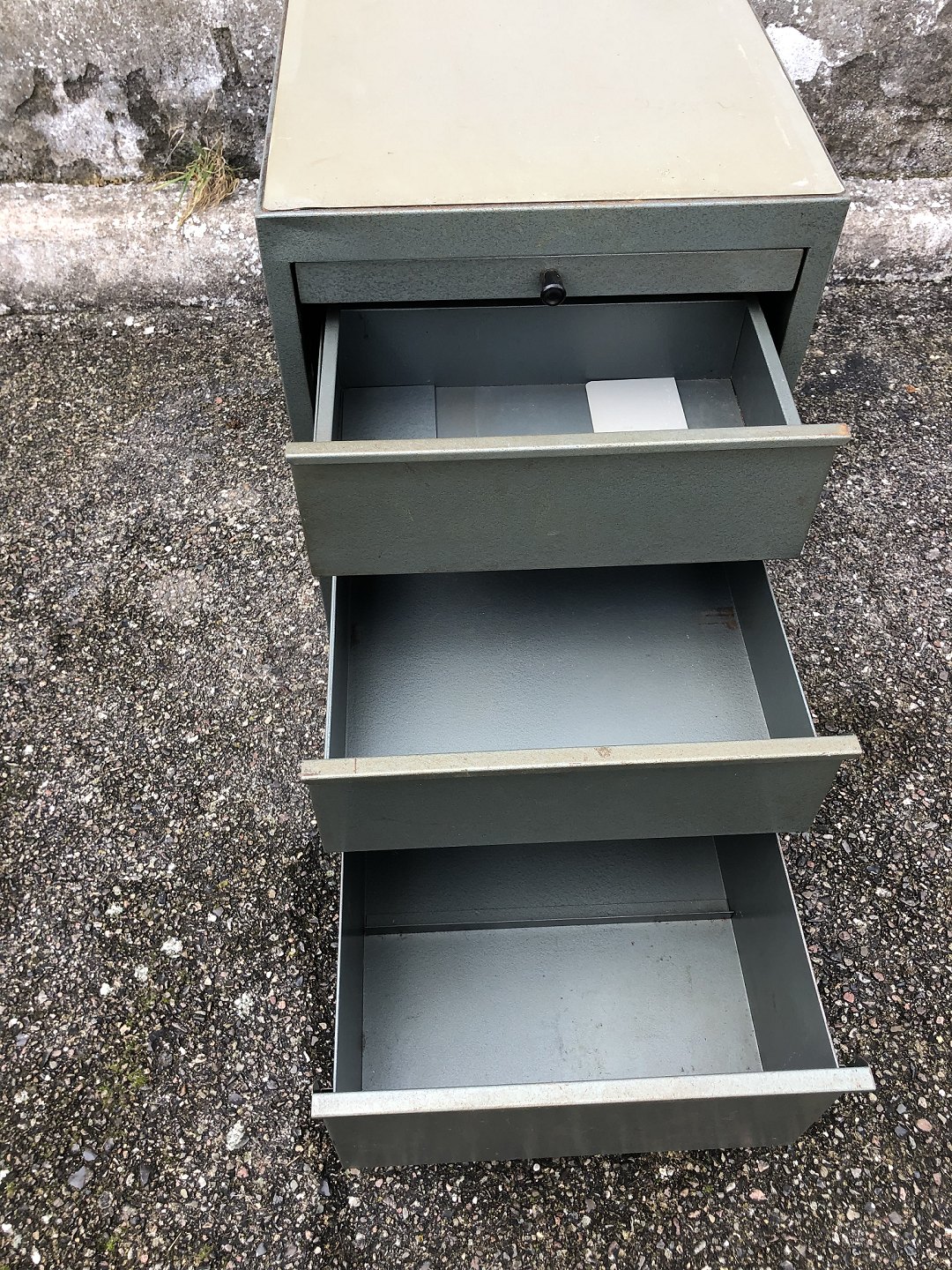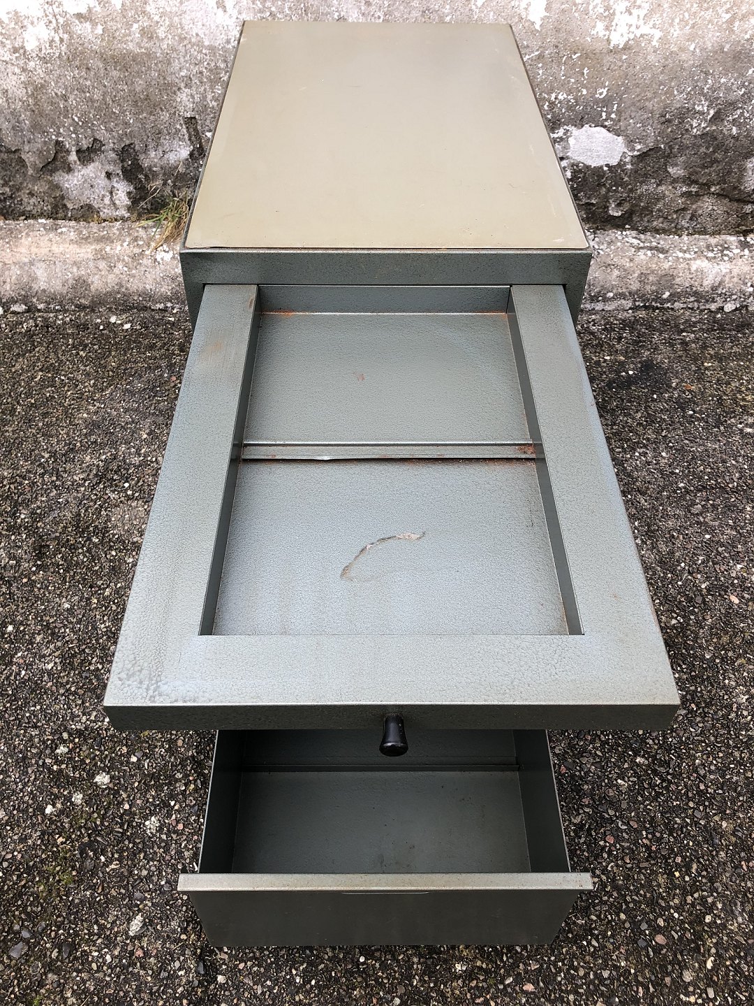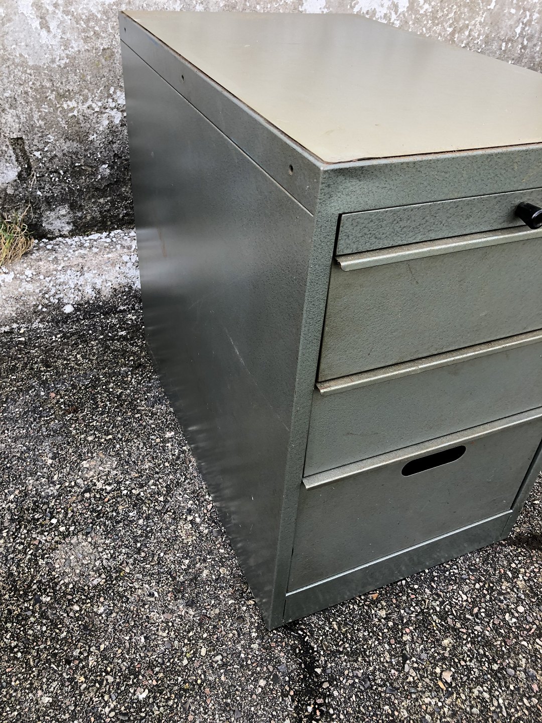 Arkivskab i malet metal med skuffer. Mål: HxBxD 68x44x71 cm. Pæn brugt stand. Kan evt. stables / se sidste billede.
