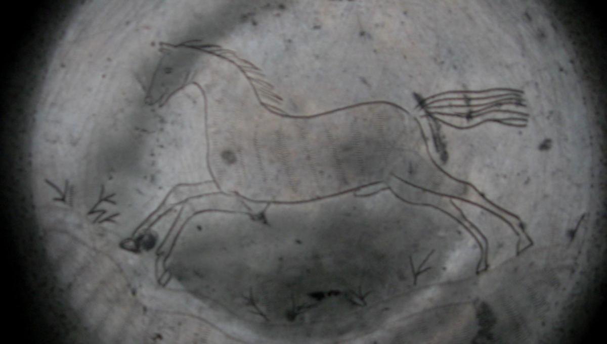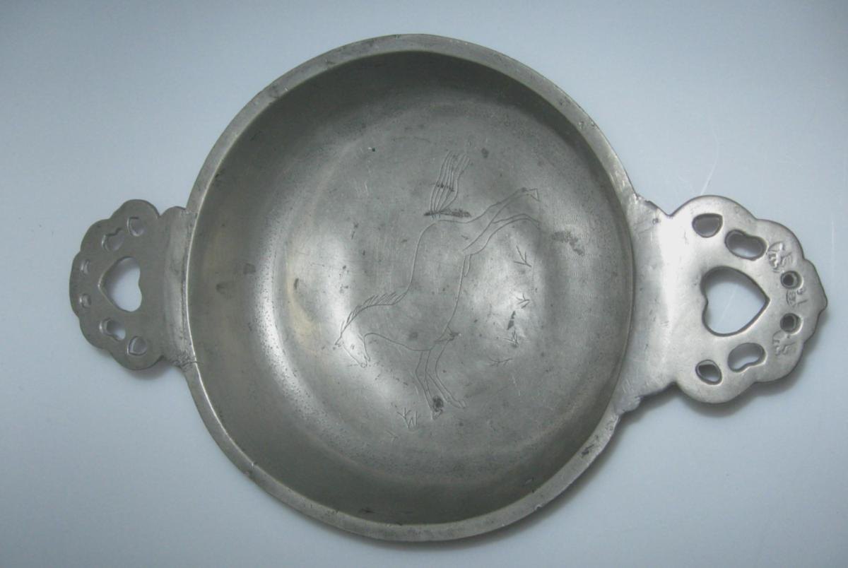 Øreskål i tin, Tyskland, 1700-tallet. Med glatte bugede sider og munding med enkelt profilering. Vandrette ører med gennembrudt, symmestrisk mønster. Lav fodplade. Stemplet på et ene øre. I bunden punslet dekoration af springende hingst. H.: 5 cm. Tværmål.: 27 cm.