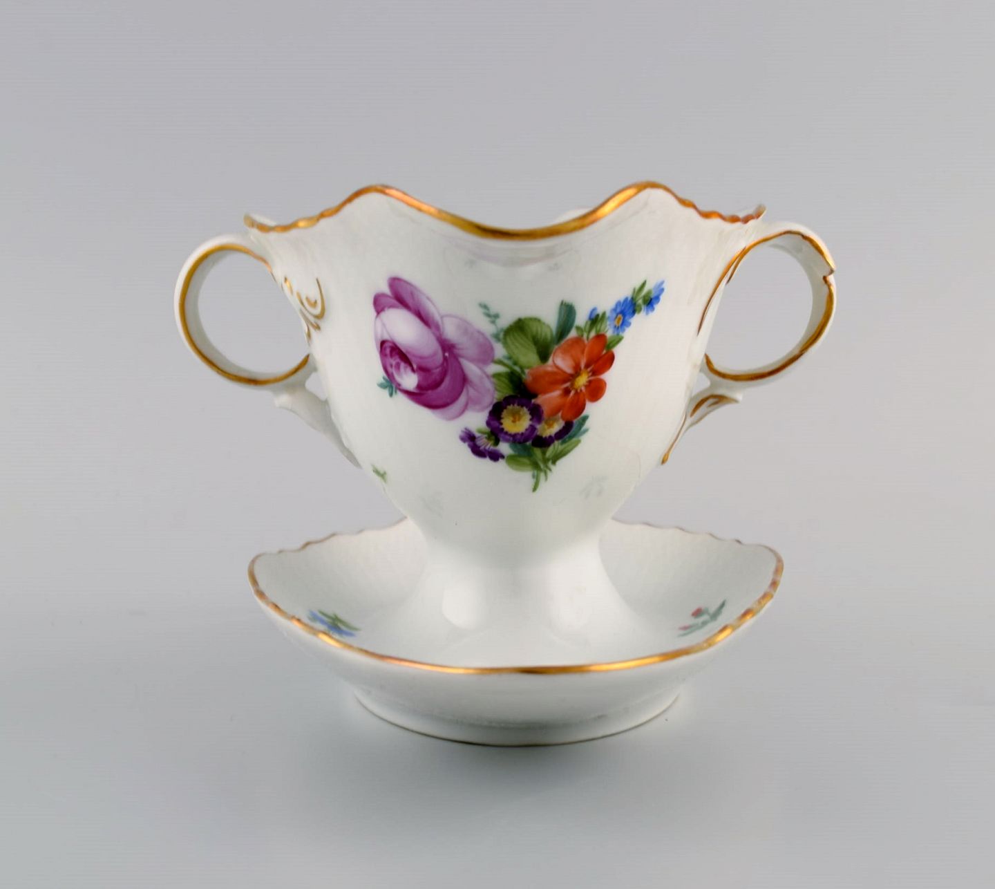 Royal Copenhagen Saksisk Blomst sovsekande i håndmalet porcelæn med blomster og gulddekoration. Modelnummer 493/1650. Tidligt 1900-tallet.