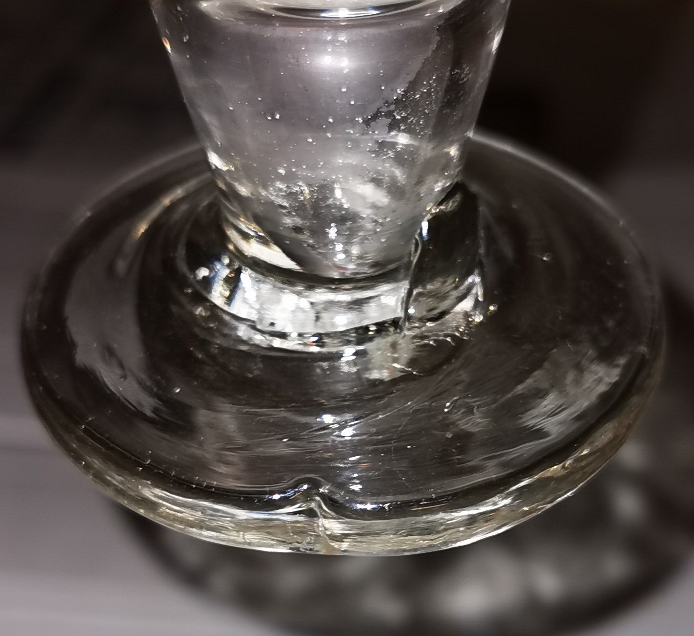 Dansk "frimurer glas" eller "rakkerglas" fremstillet i 19. århundrede. Lidt "tåget" på indersiden af den hule stilk. Mindre produktionsfejl på foden (IKKE ET SKÅR). H. 11 cm.