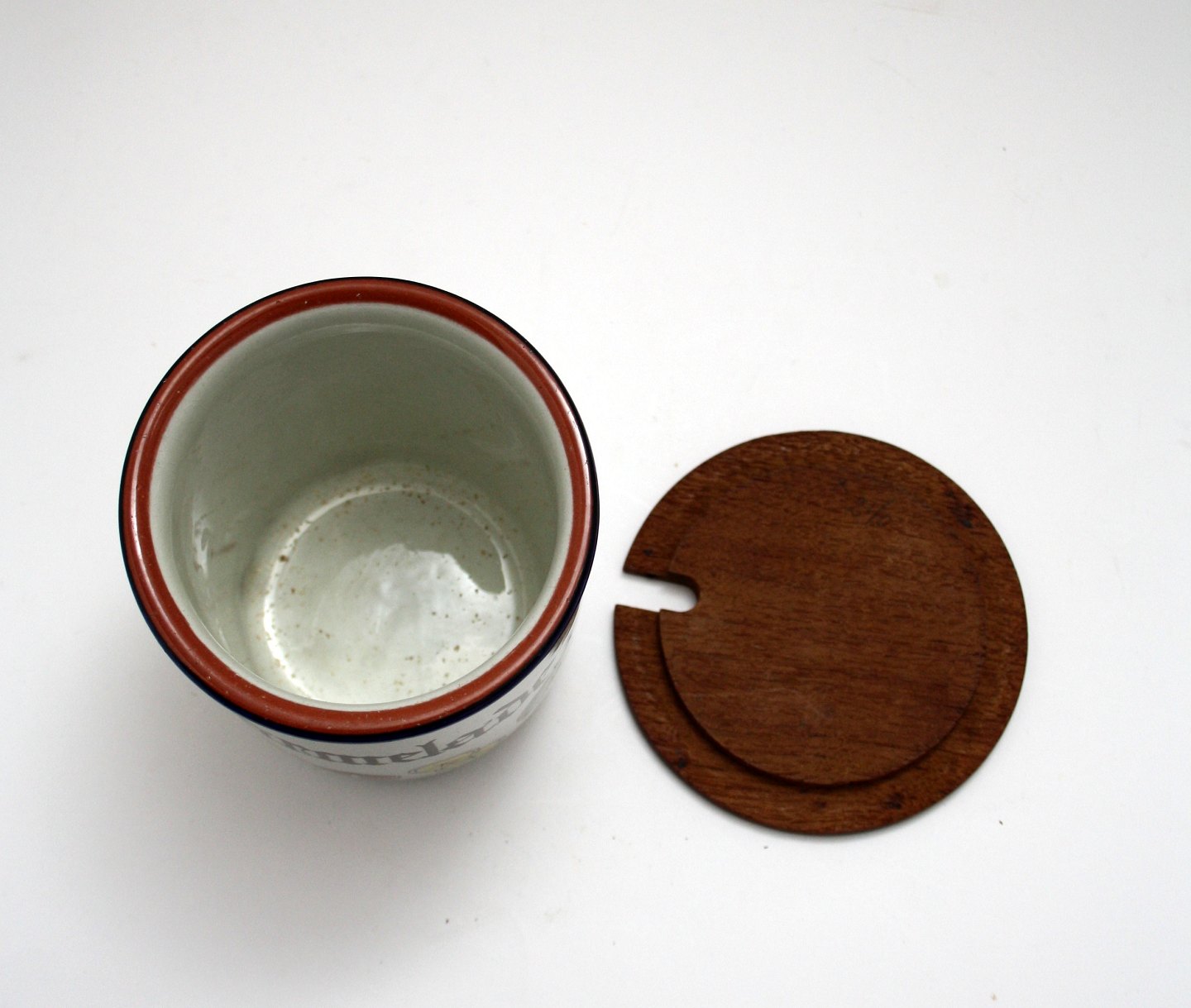 Marmelade med låg med plads til ske (stor). Højde 11 cm. Diameter 10,5 cm. Overfladekrakeleringer indvendig. Pris: 150 kr.