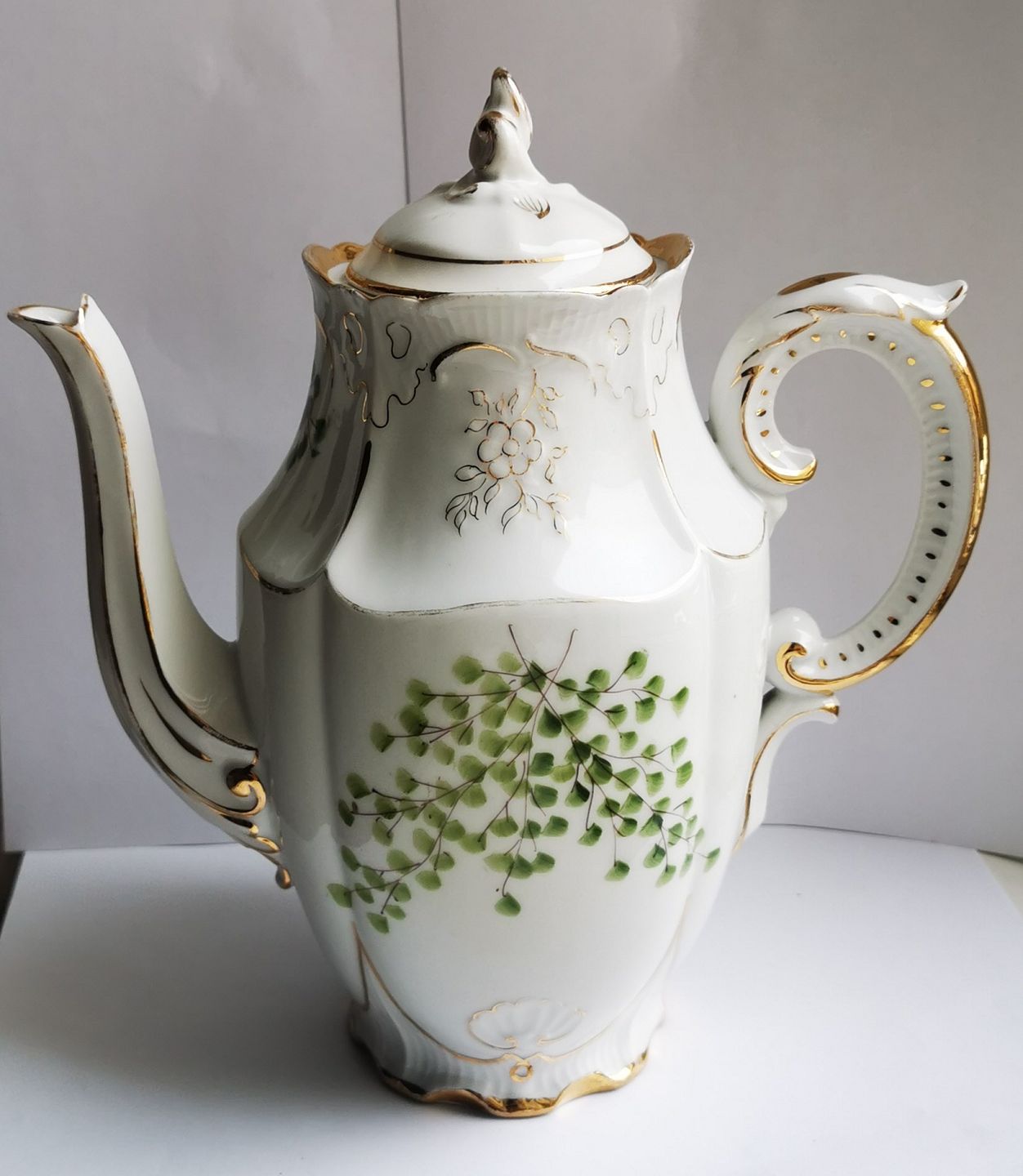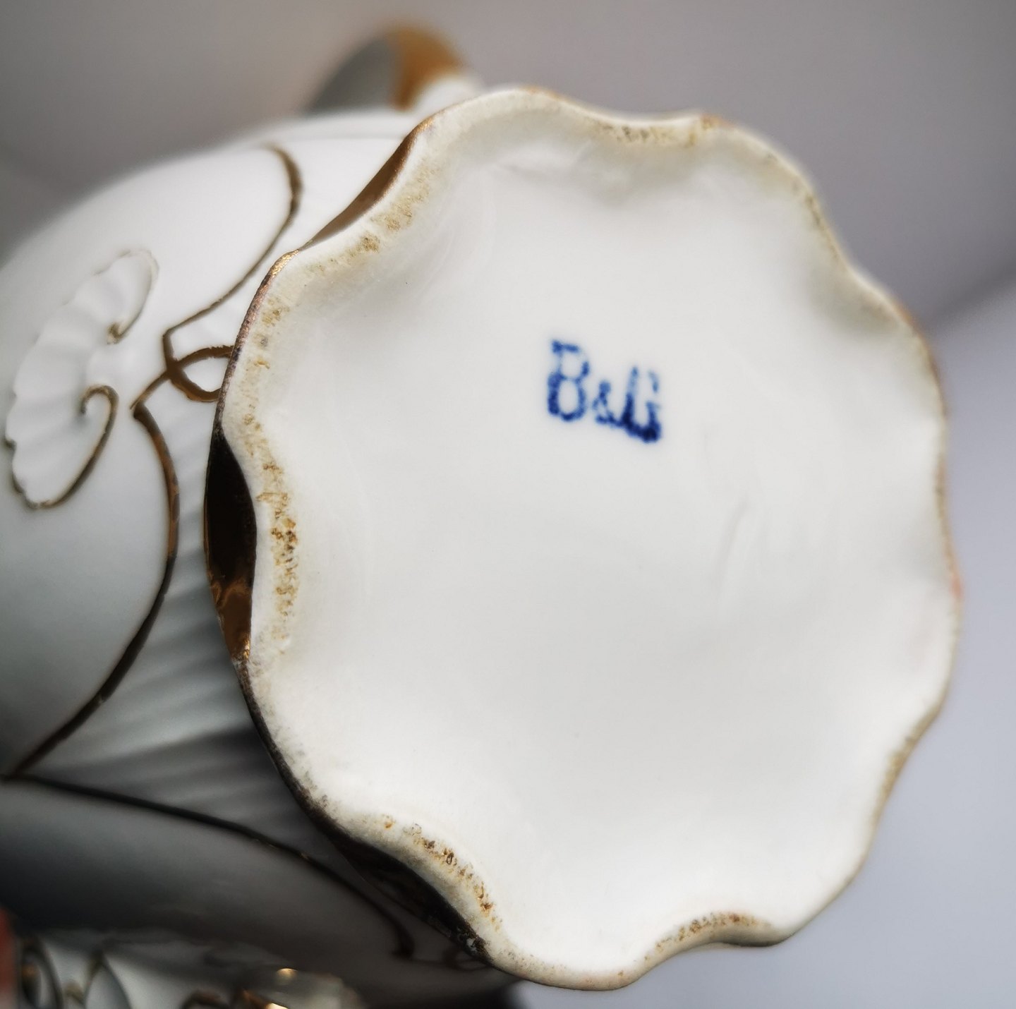 Kaffekande i porcelæn fra Bing & Grøndahl fra slutinngen af 19. århundrede. Dekoreret med bladværk på to sider. Fremstår i god stand uden skader eller reparationer. Fabriksmærket på bunden med B&G. H. 25½ cm (10.03 inches).