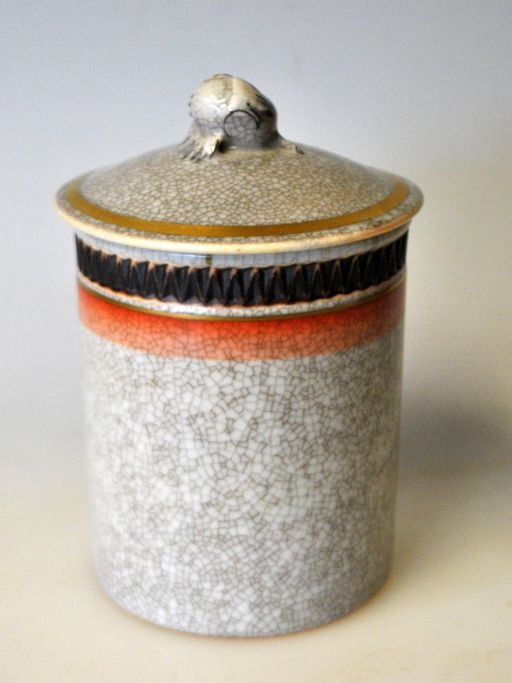 Royal Copenhagen låg krukke, 259/2772, 20. årh. København, Danmark. Grålig skærv med brune og lysrøde dekorationer, Med partielle forgyldninger. Topfigur af blomsterknop. Stemplet. H.: 10 cm.
