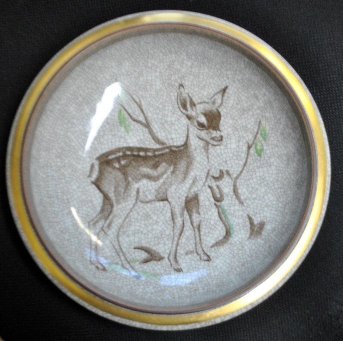 Royal Copenhagen, Rundt Craquelle fad, 810/3606, 20. årh. København, Danmark. Grå skærv med håndmalet dekoration af et kid. Med forgyldninger. Stemplet. H.: 5,5 cm. Dia.: 25,5 cm.