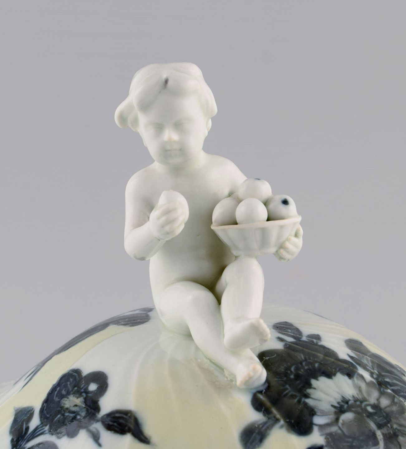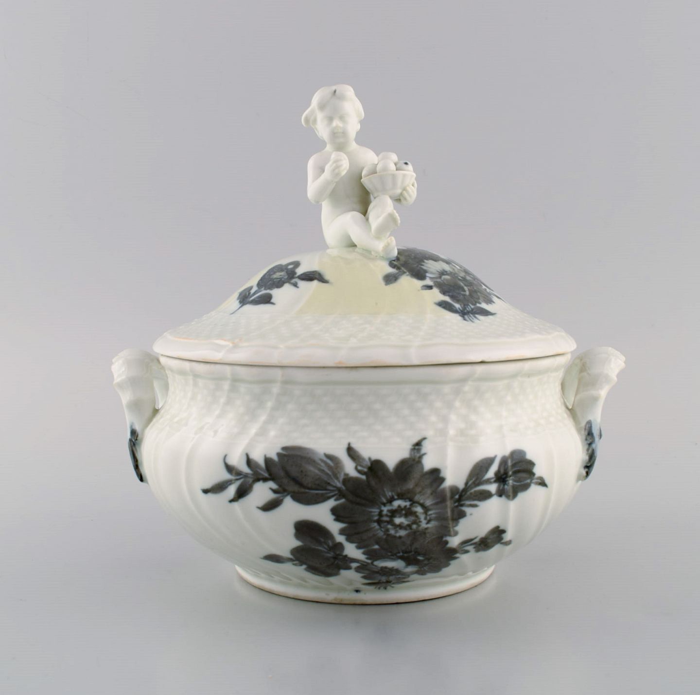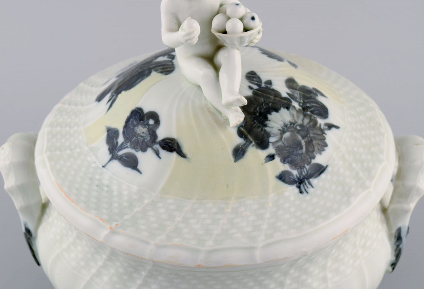 Tidlig Royal Copenhagen Blå Blomst Svejfet lågterrin i porcelæn med håndmalede blomster. Låg modelleret med frugtspisende putti. Ca. 1820.