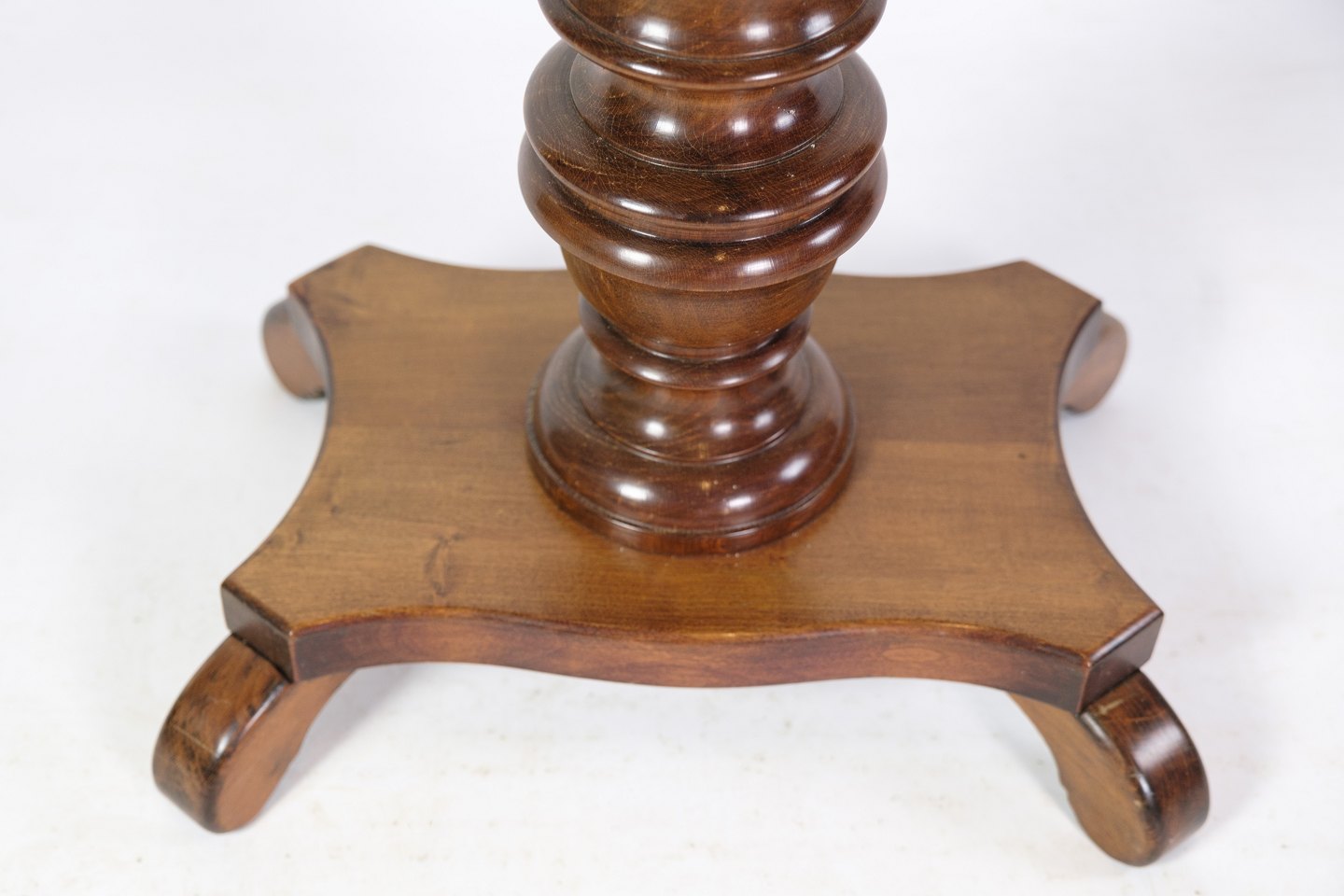Ovalt sybord / lampebord på søjle med syrum i mahogni fra omkring 1890'erne.