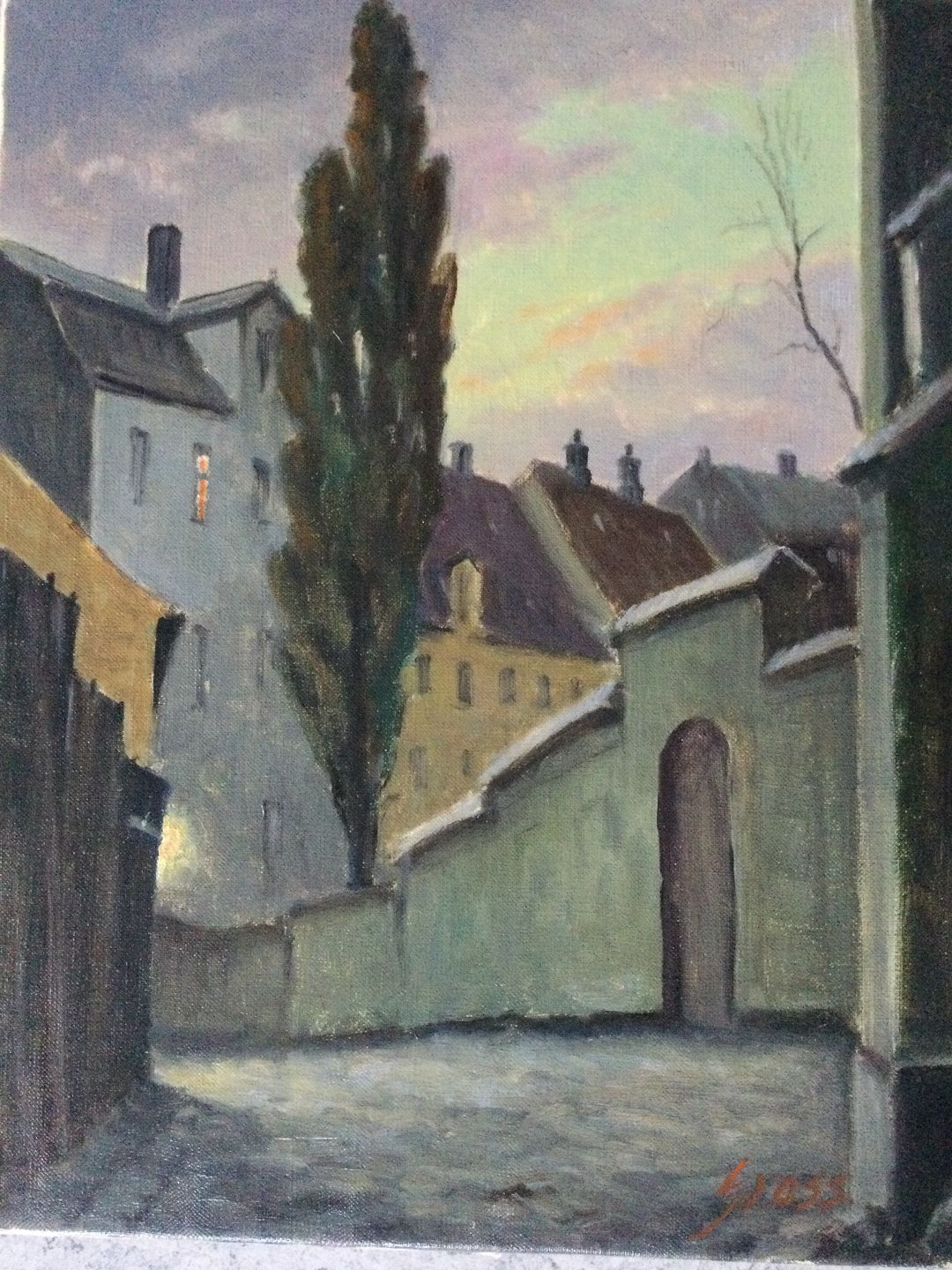 Text available in Danish: Maleri af Einar Gross - Parti fra Latinergyden, Aalborg.