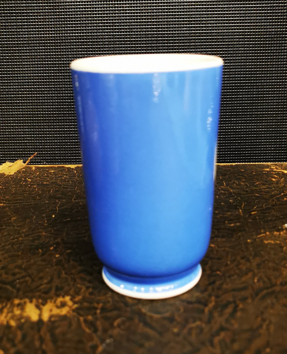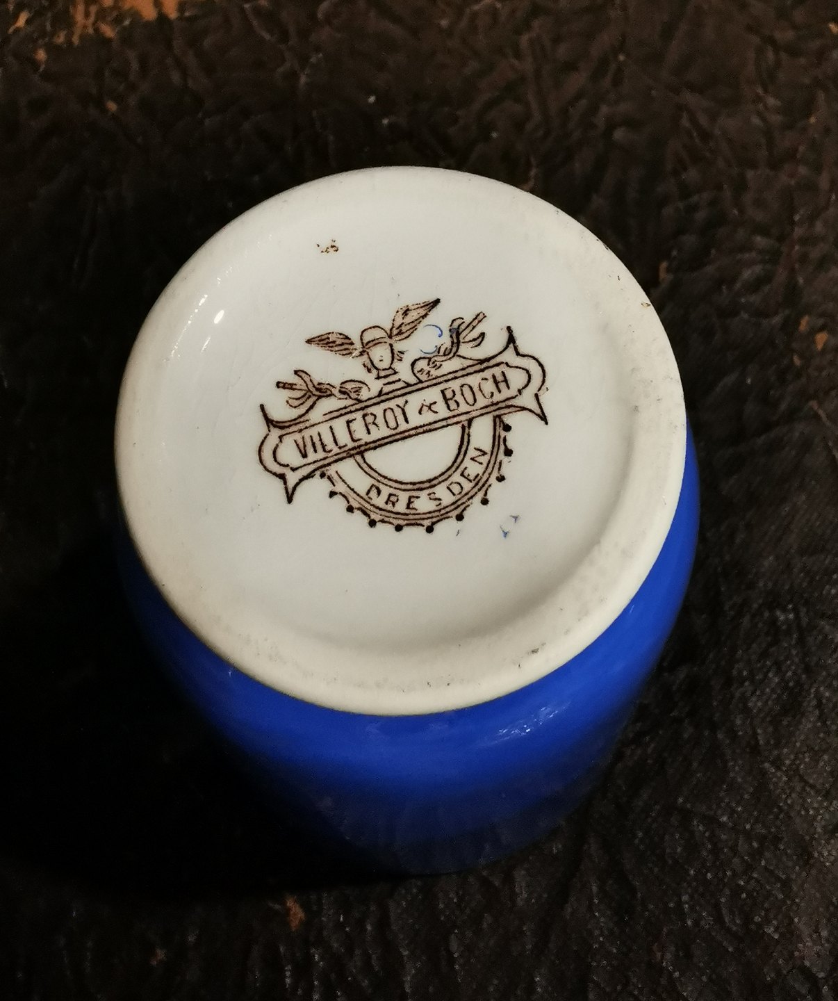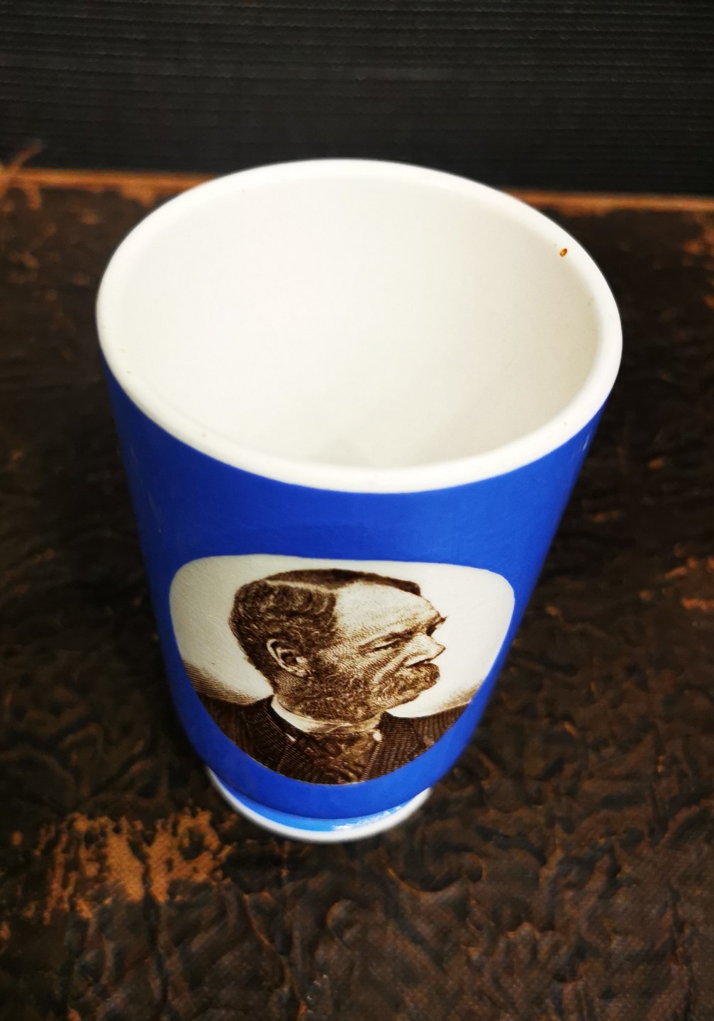 Blåt bæger i fajance fra Villeroy & Boch med portræt af den danske Kong Christian IX fra omkring 1900. Fremstår i god stand uden skader eller reparationer. Fabriksmærket på bunden. H. 11½ cm (4.52 inches)
