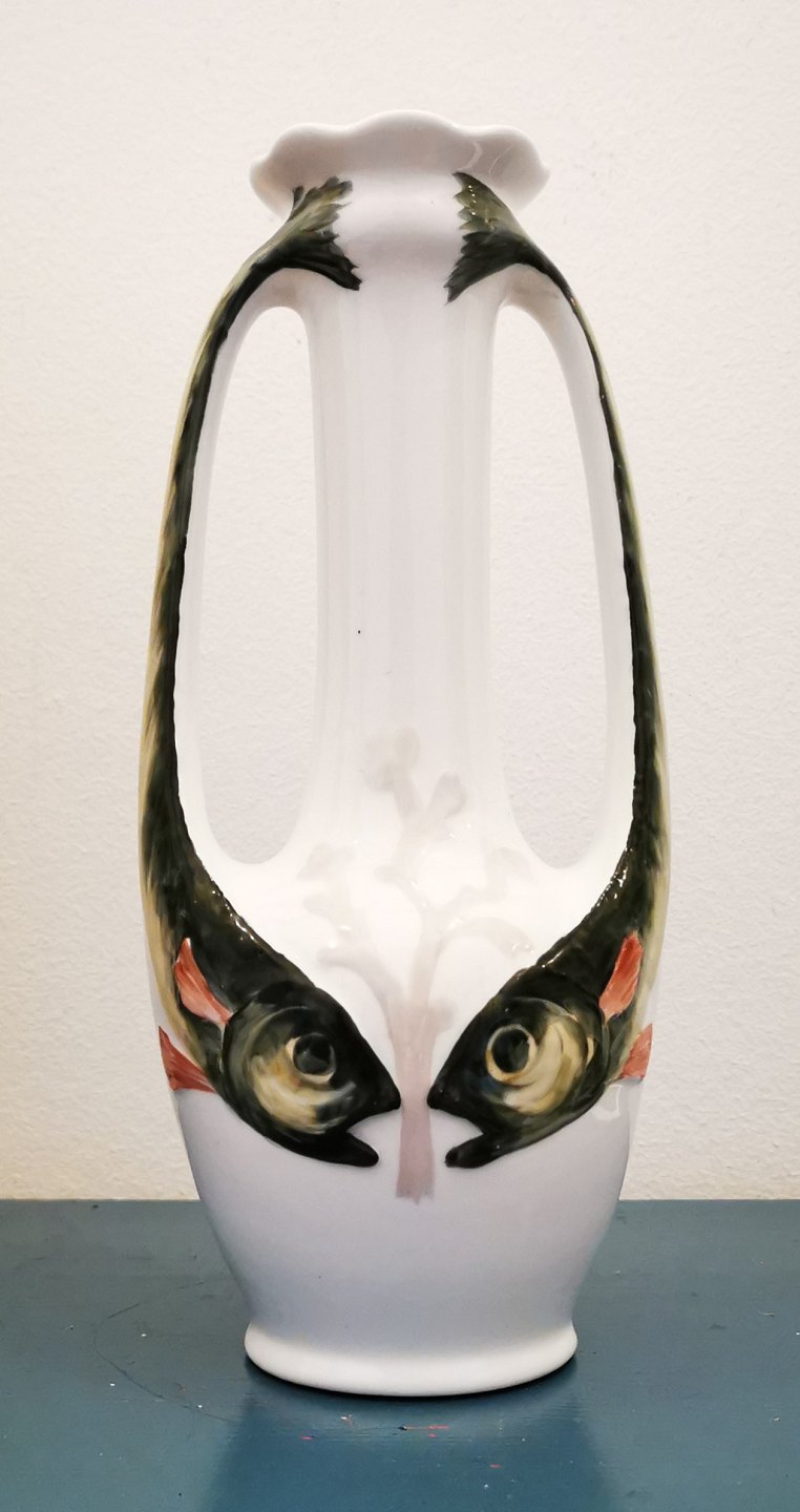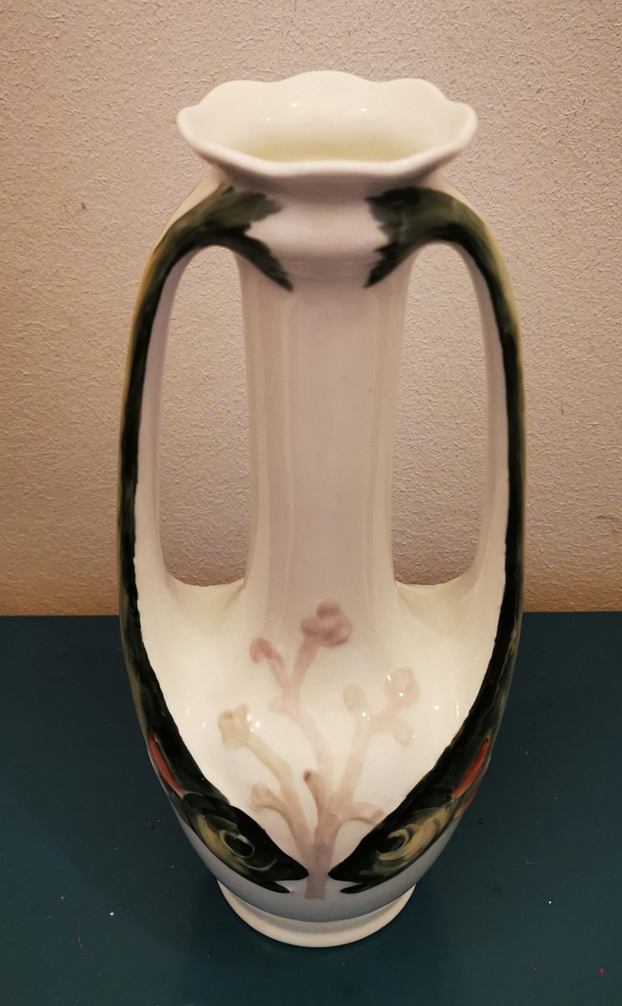 Art Nouveau Rörstrand vase med håndtag. Dekoreret med fisk i relief nedad håndtagene. Fremstår i perfekt stand uden skader eller reparationer. Fremstillet omkring 1900 hos Rorstrand, Sverige. H. 29 cm