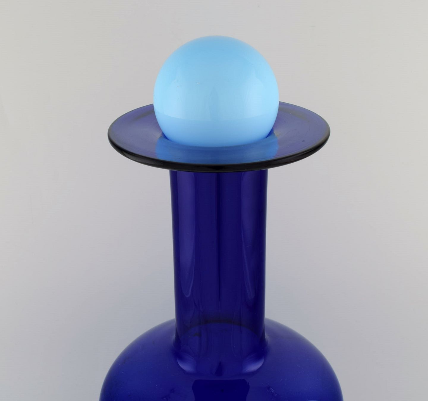 Otto Brauer for Holmegaard. Stor vase/flaske i blåt kunstglas med lyseblå kugle. 1960'erne.