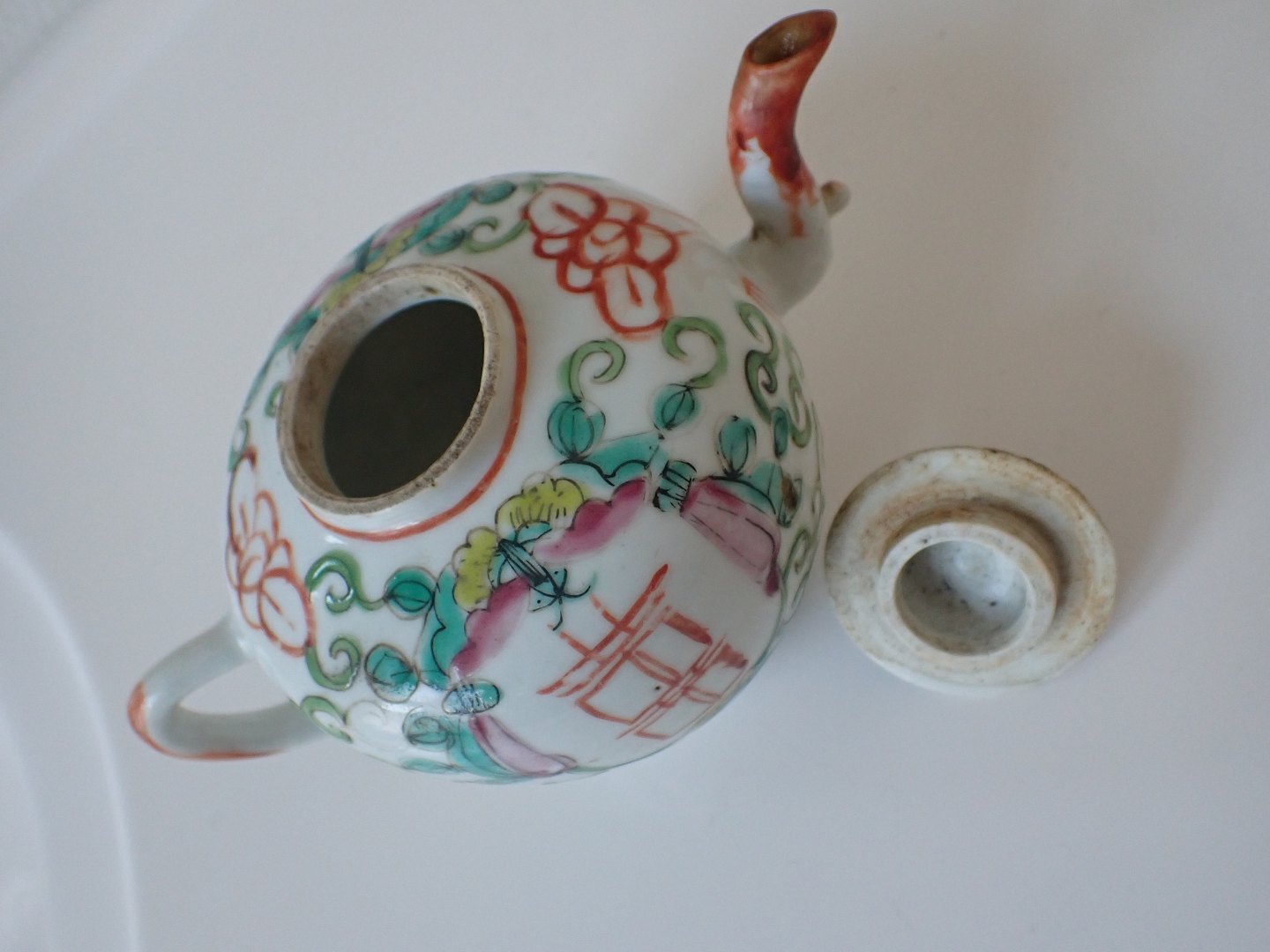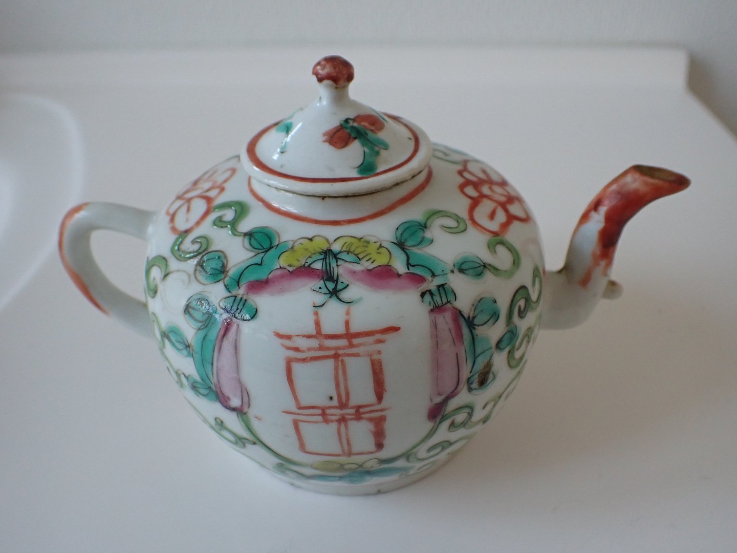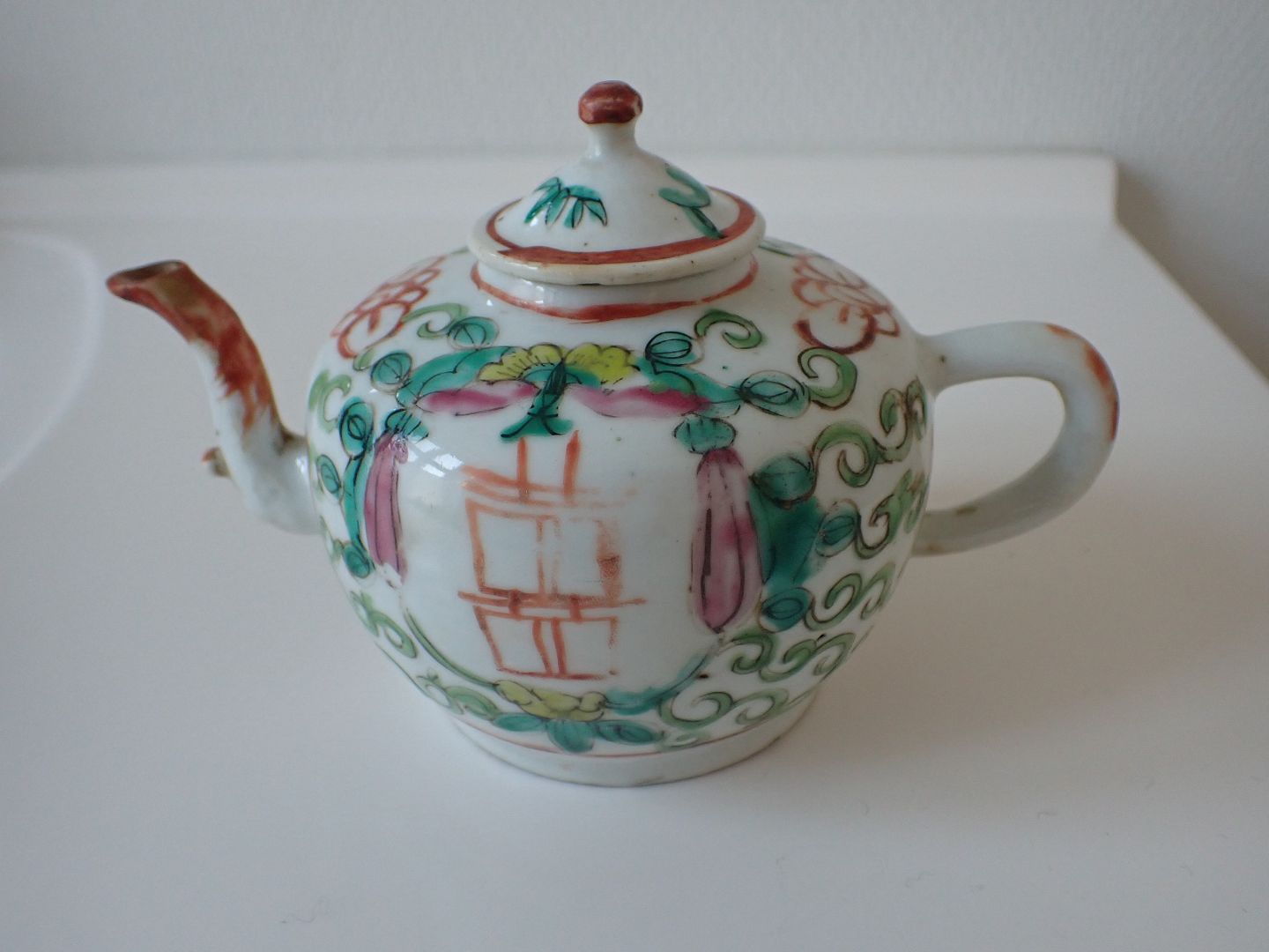 Kinesisk te-/sakekande med skrifttegn og sommerfugle. Tao Kuang (1821 - 1850). Family Rose dekoration. Højde med låg: 10,2 cm. I pæn tidstypisk stand uden skår.