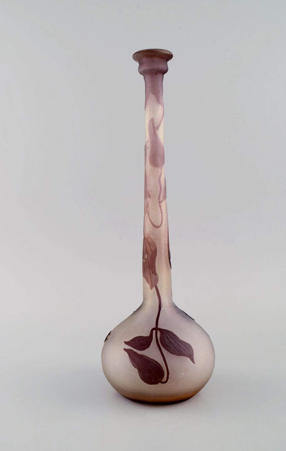 Narrow neck Emile Gallé vase in frosted and purple art glass carved in the form of foliage. Early 20th century.