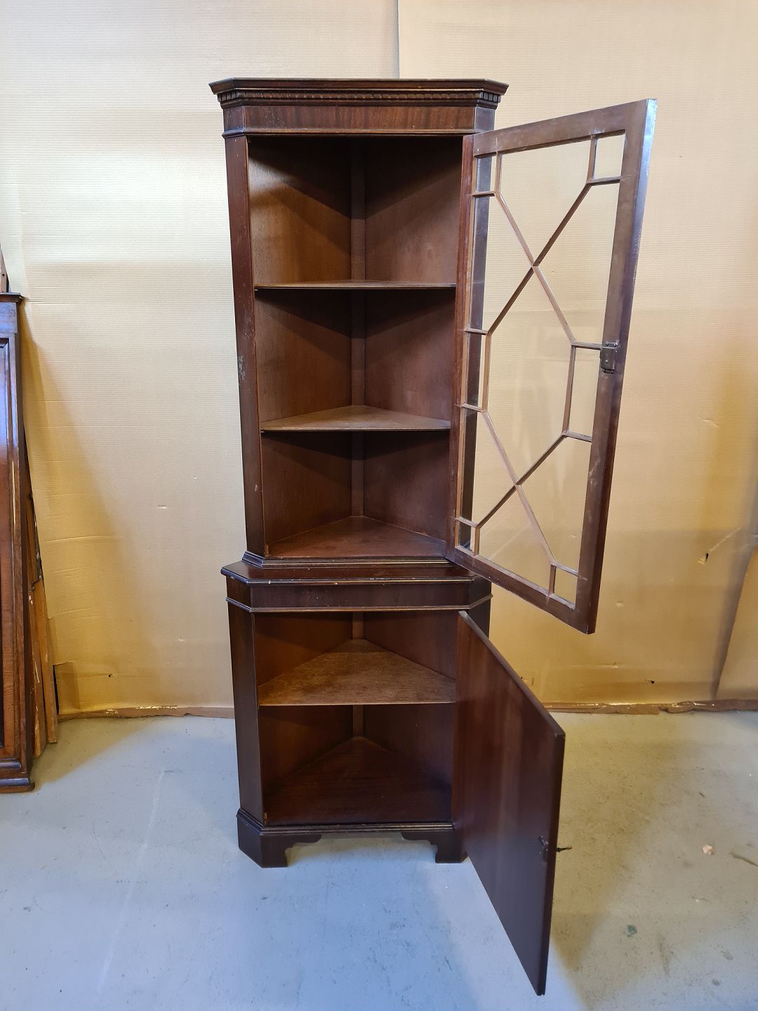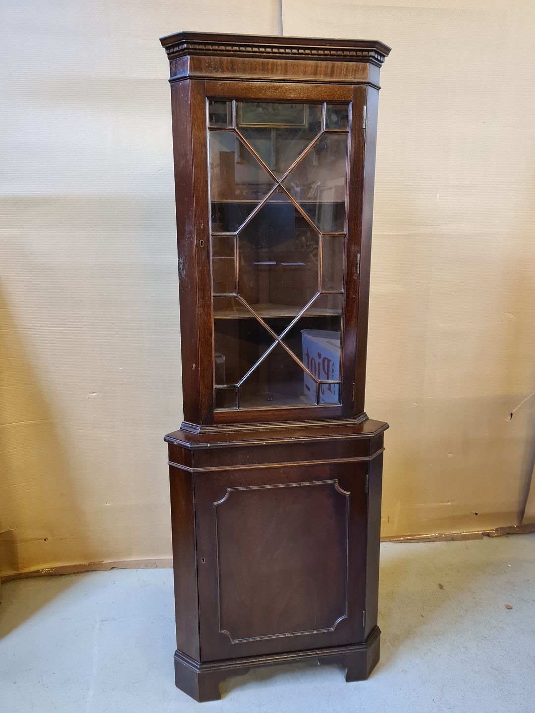 Hjørneskab i fineret mahogni fra 1980erne.