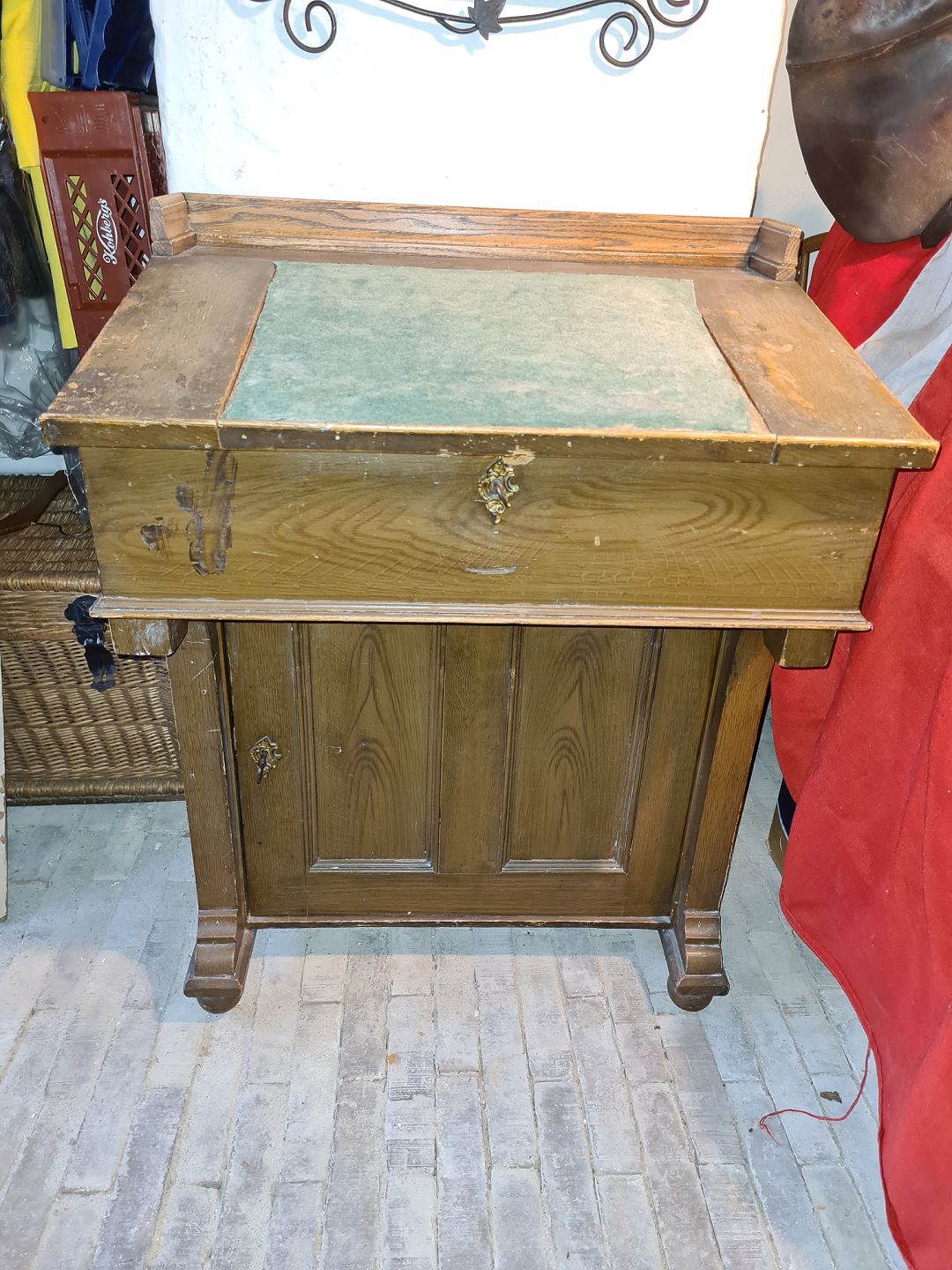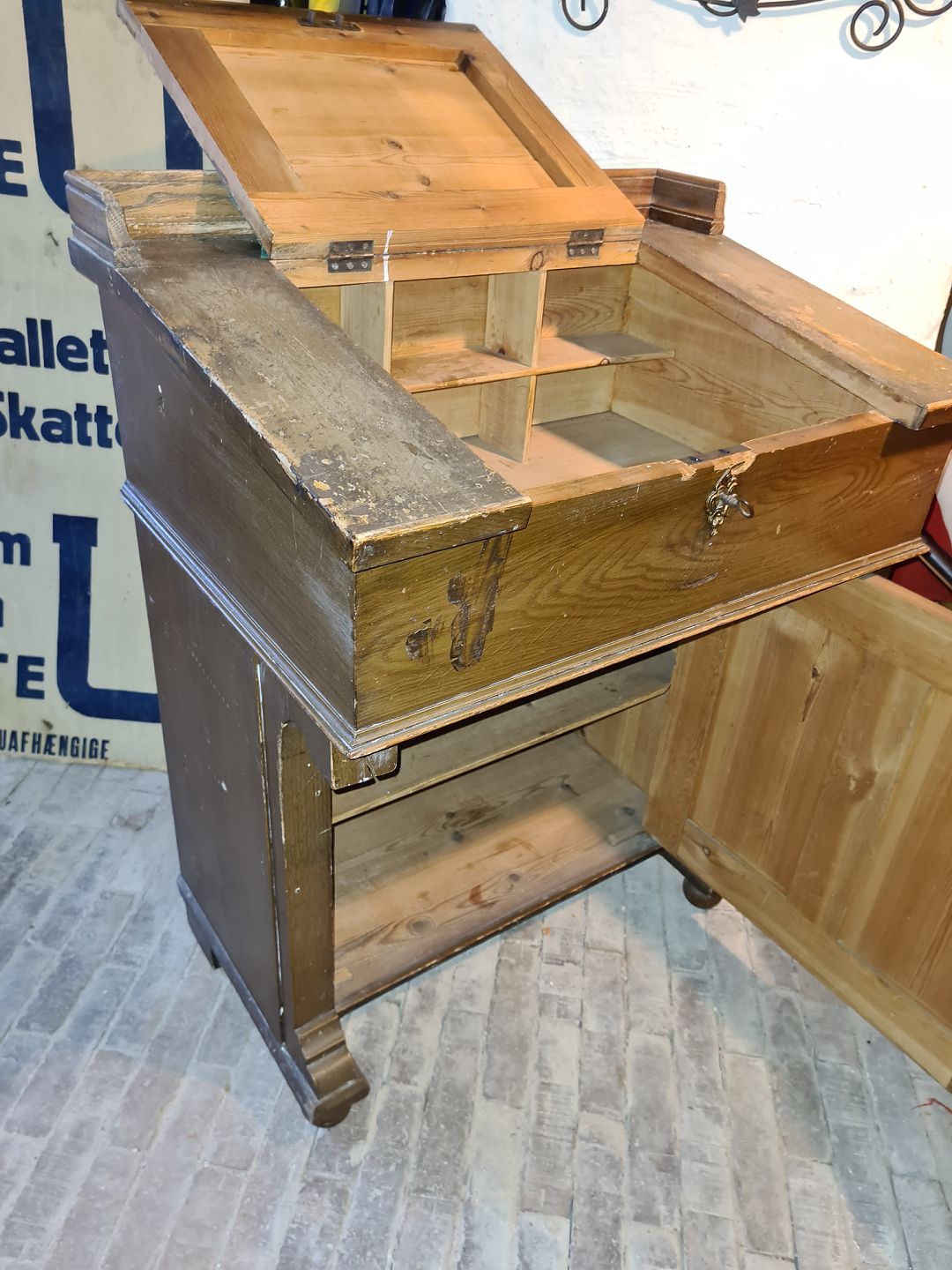 Gammel skrivepult fra starten af 1900 tallet i fyr med filtoverflade. Fremstår flot for alderen med enkelte overfladiske skader.