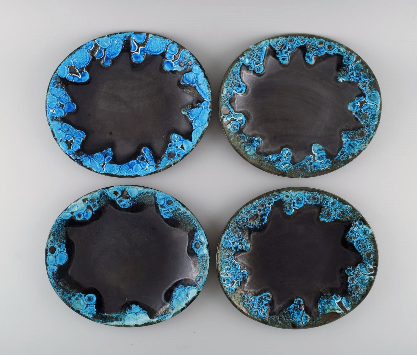 Fransk keramiker. 24 middagstallerkener i glaseret stentøj. Smuk glasur i azurblå nuancer. Unika keramik af høj kvalitet. Midt 1900-tallet.