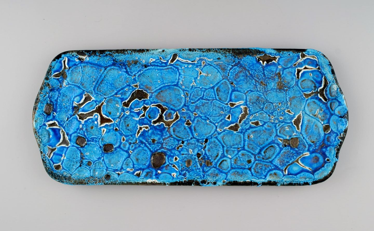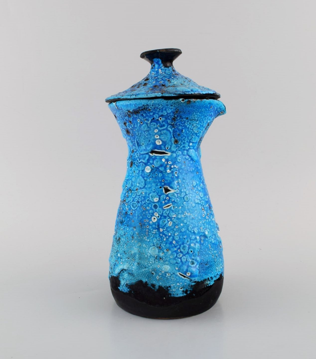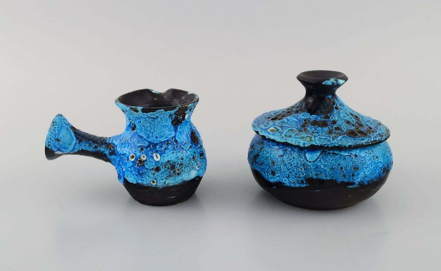 French ceramist. Unique coffee service in glazed stoneware. Beautiful glaze in light blue shades. Mid-20th century.