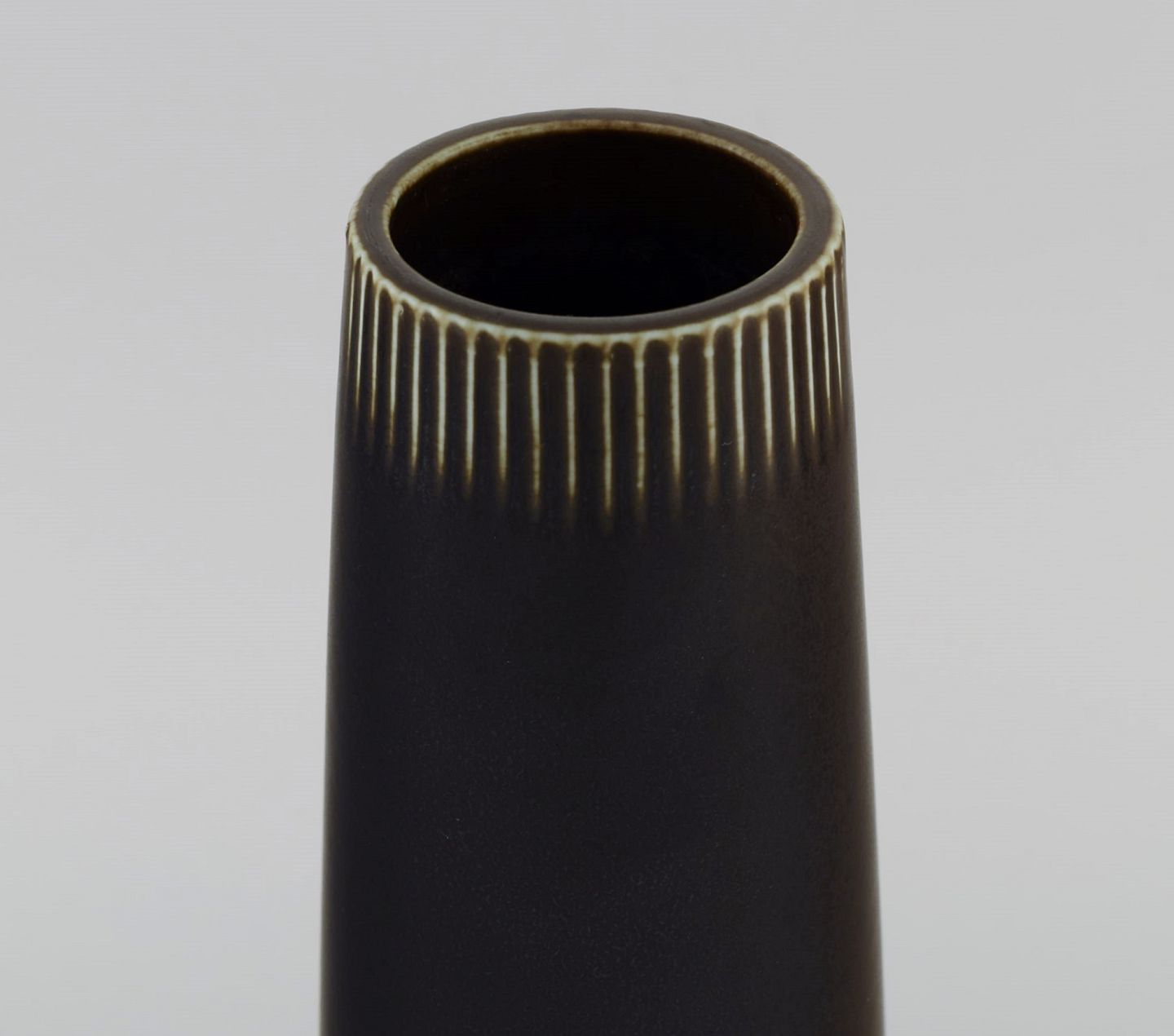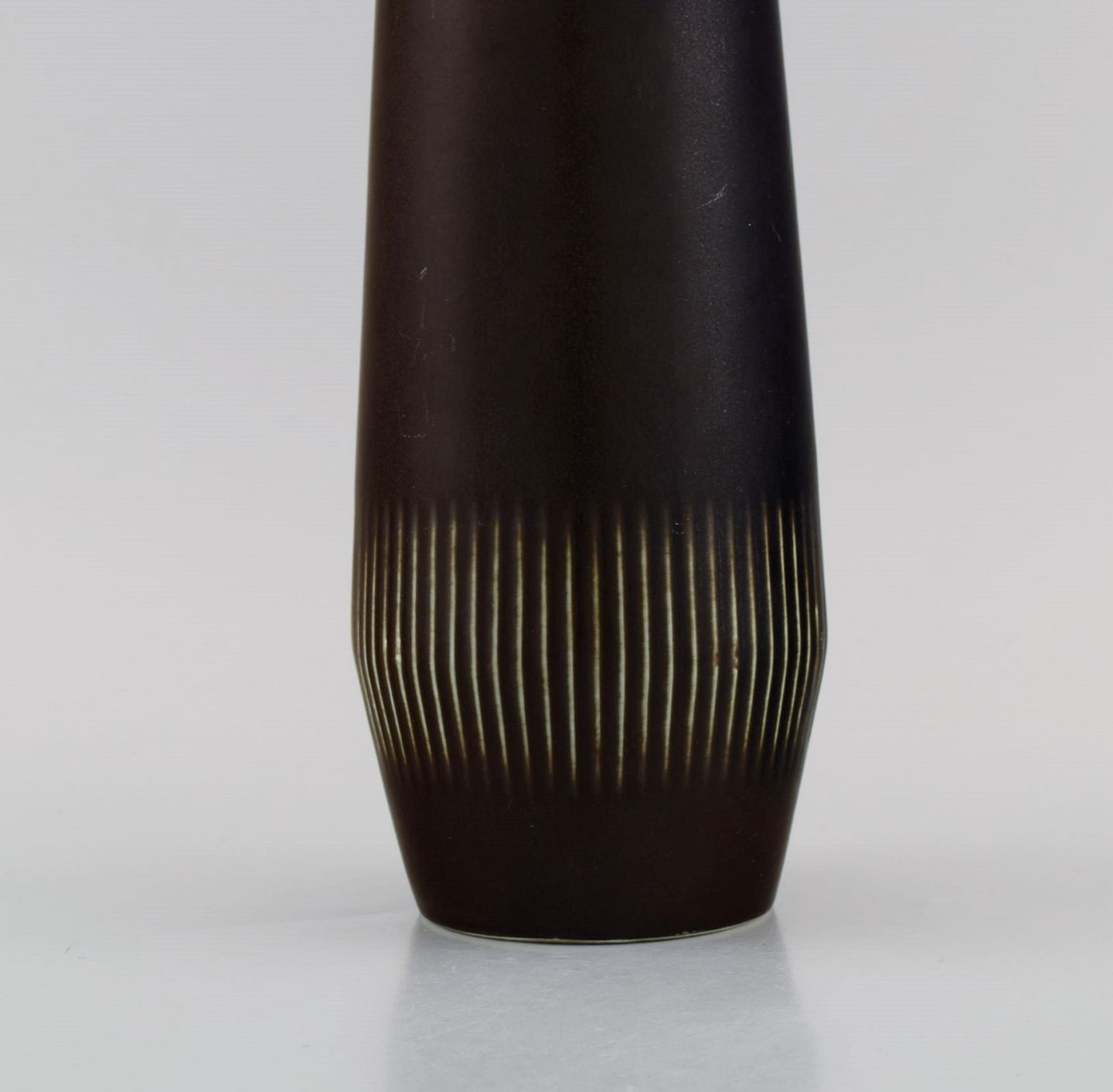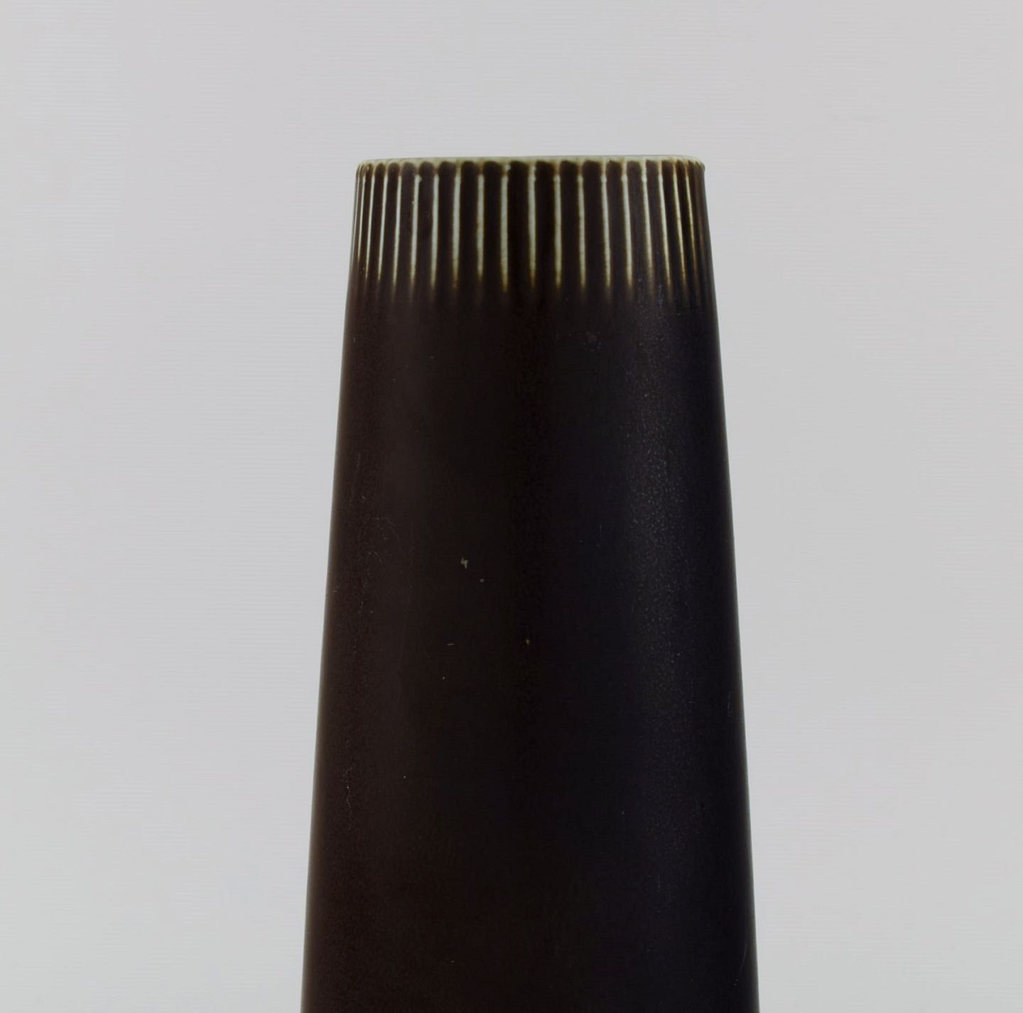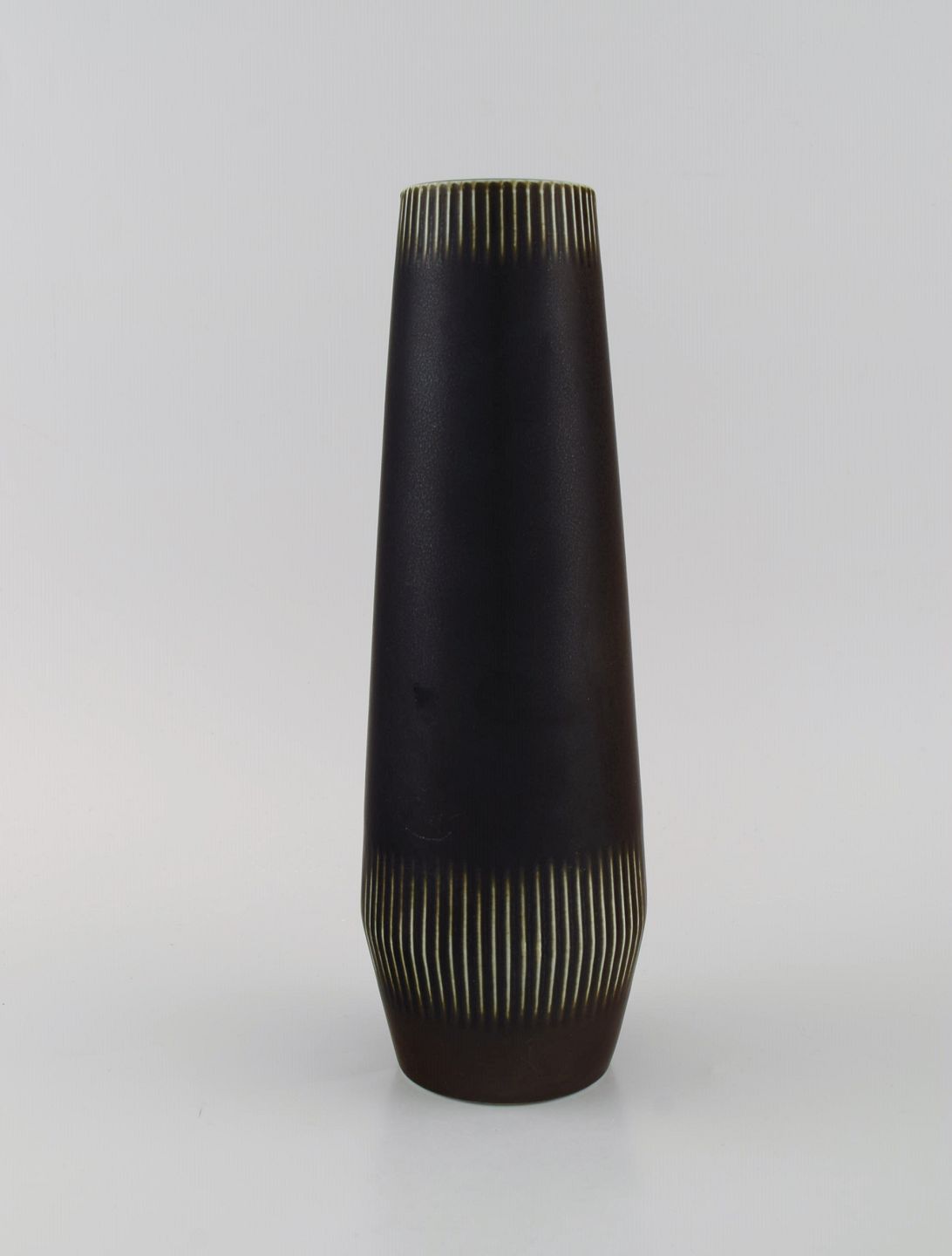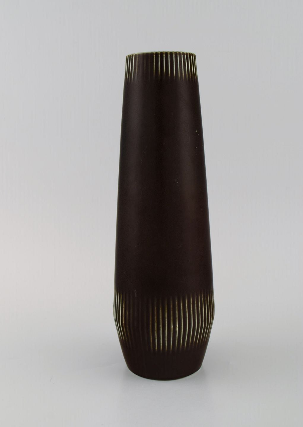 Carl Harry Stålhane (1920-1990) for Rörstrand. Vase i glaseret keramik med vertikalt indridset mønster. Smuk glasur i dybe aubergine nuancer. Midt 1900 tallet.