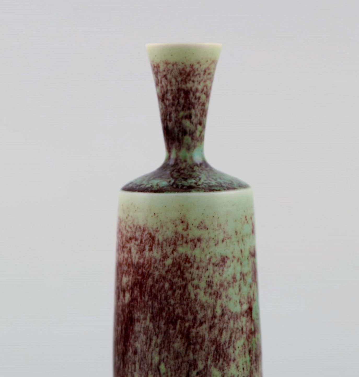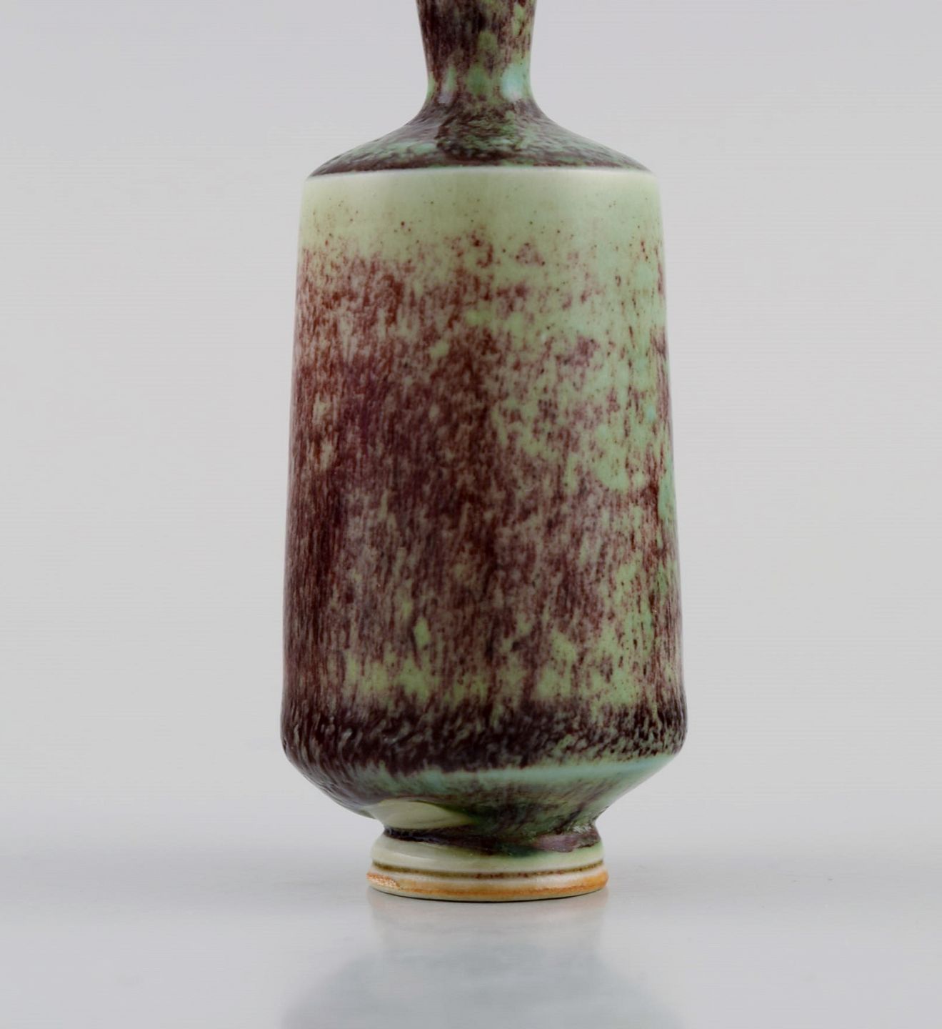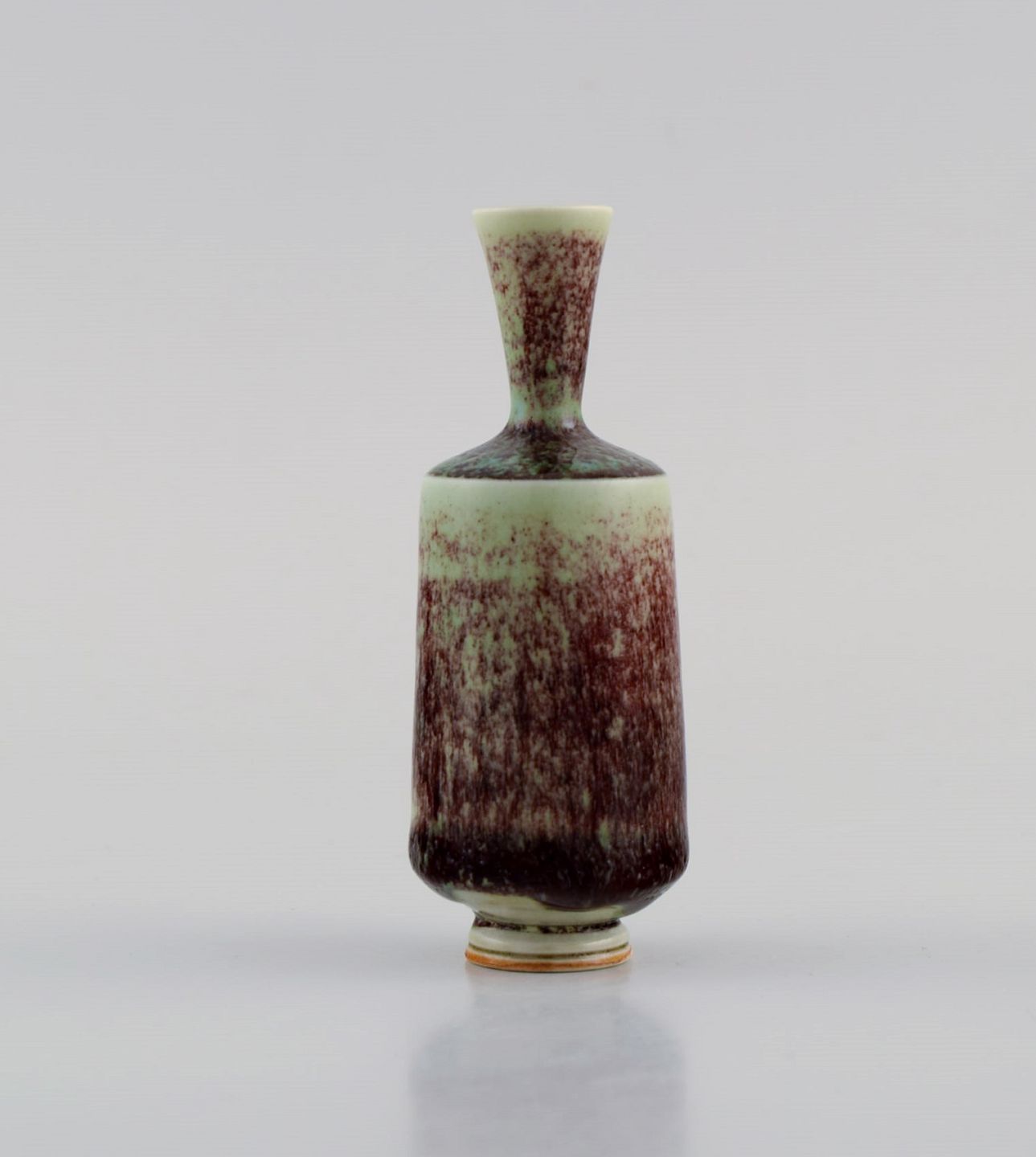 Berndt Friberg (1899-1981) for Gustavsberg Studiohand. Miniature vase i glaseret keramik. Smuk glasur i lilla og turkis nuancer. 1970'erne.