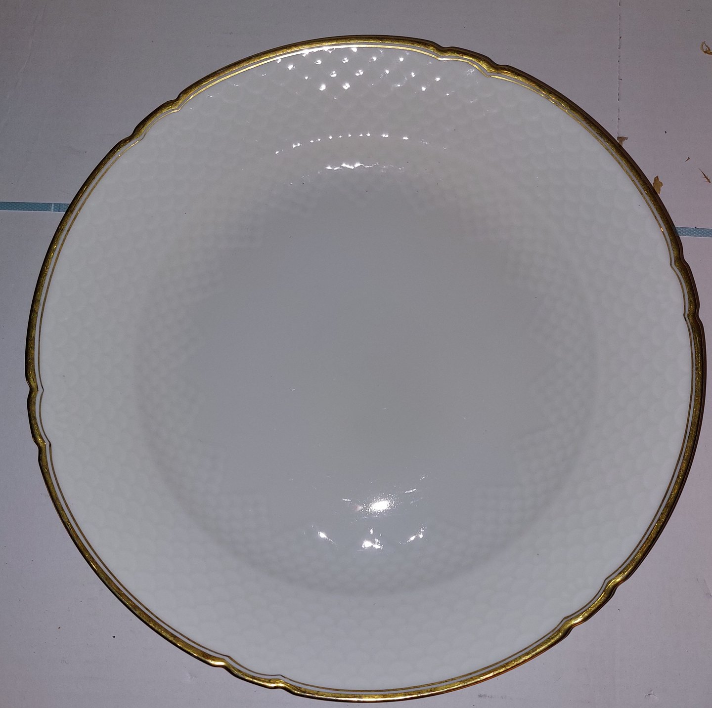 Stort Hartmann fad i porcelæn med guldkant fra Bing & Grøndahl. Fremstår i perfekt stand. 1. sortering. Modelnummer 20. Mål: H. 4½ cm Ø. 31½ cm