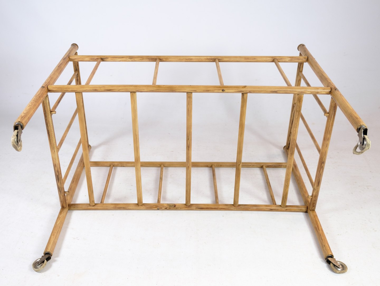 Antik barneseng i lyst fyrretræ med hjul fra omkring år 1920'erne.