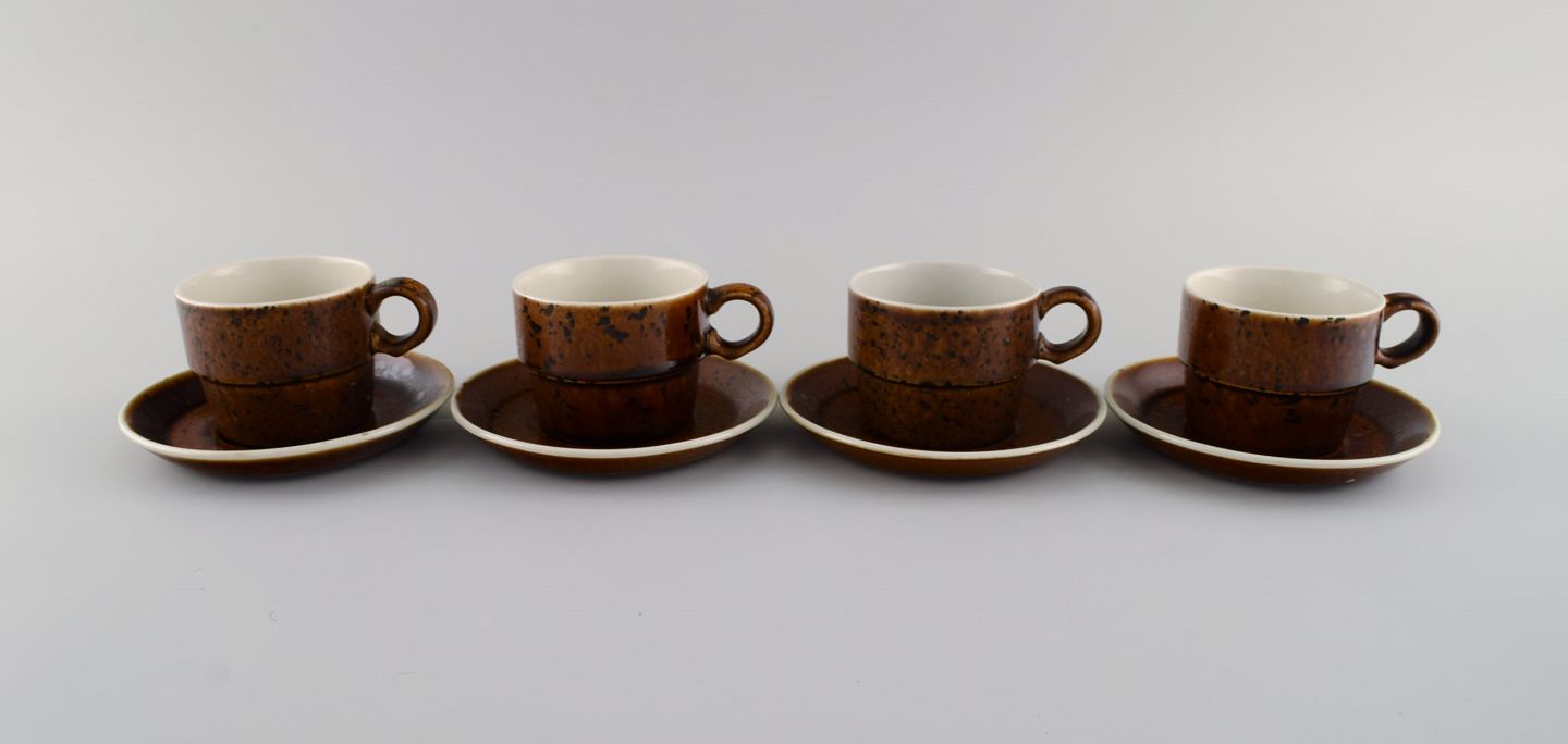Stig Lindberg for Gustavsberg. Tolv Coq kaffekopper med underkopper i glaseret stentøj. Smuk glasur i brune nuancer. Svensk design, 1960'erne.